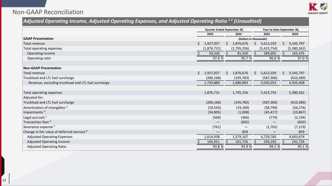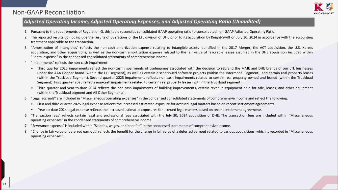 当四半期には、3,480万ドルの減損費用(LTL(less-than-truckload)ブランドを1つの商号に統合することを決定したことによる商号の減損2,880万ドル、不動産リースおよびソフトウェアの減損600万ドル)、偶発損失1,120万ドル、2024年の第三者運送人向け保険事業からの撤退に関連する偶発損失1,120万ドル、U.S.エクスプレスにおける保険金請求費用の増加1,200万ドルが含まれます。2024年の第三者運送人保険事業からの撤退に関連する200万ドル、U.S.エクスプレスにおける保険金およびクレーム費用の増加120万ドル(主に、2023年7月の買収前に発生したU.S.エクスプレスの自動車損害賠償請求と、その直後に発生したU.S.エクスプレスの自動車損害賠償請求の和解によるもの)。この減損は、本リリースに続く調整表のとおり、非GAAPベースの業績から調整されています。逆に、偶発損失および保険金請求による和解金は調整後EPSに0.10ドルのマイナスの影響を与えました。
