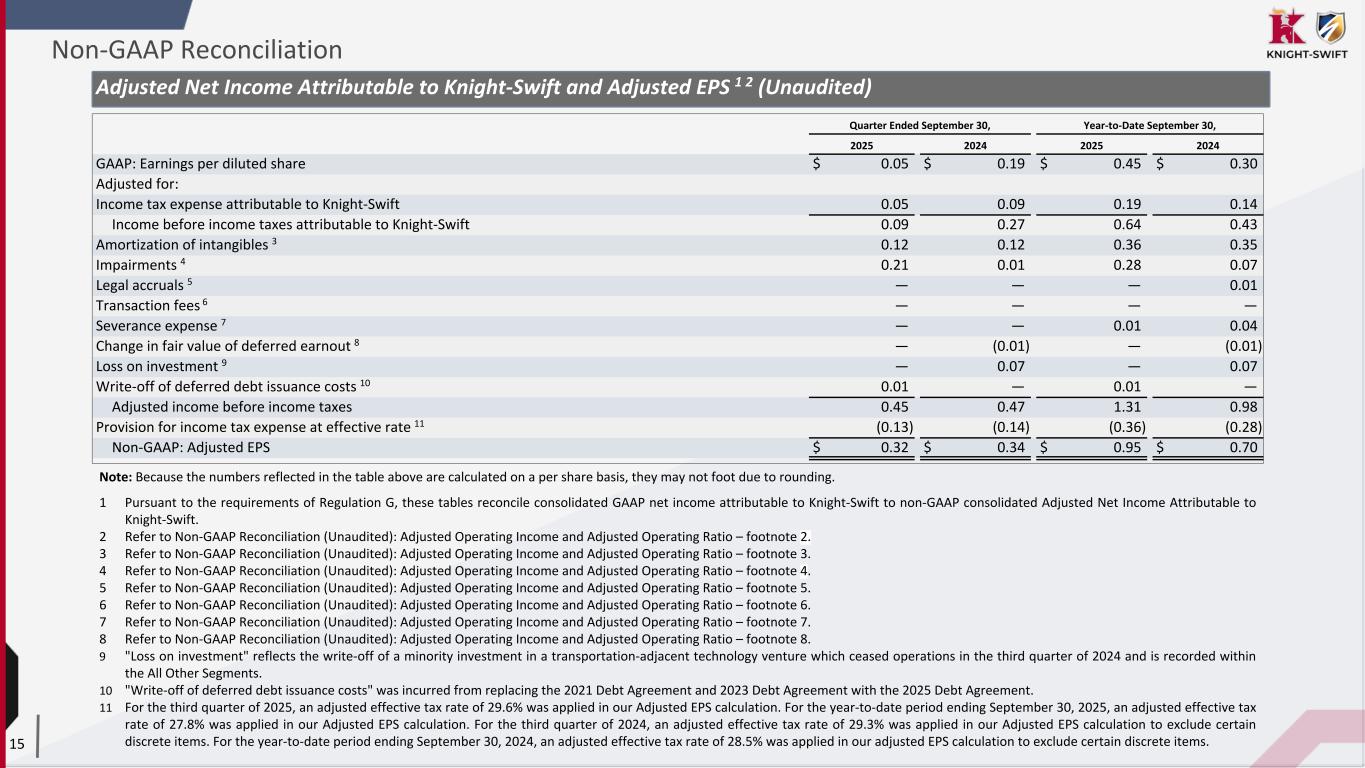 北米最大のフル・トラック・ロード・フリートを運営する最大かつ最も多角的な貨物輸送会社の1つであるKnight-Swift Transportation Holdings Inc.(NYSE:KNX)(「Knight-Swift」または「会社」)は本日、Knight-Swiftに帰属する2025年第3四半期の純利益が790万ドル、Knight-Swiftに帰属する調整後純利益2が5,130万ドルになったと発表しました。2025年第3四半期のGAAPベースの希薄化後1株当たり利益は0.05ドルで、2024年第3四半期は0.19ドルでした。調整後EPS2は、2024年第3四半期の0.34ドルに対し、2025年第3四半期は0.32ドルでした。