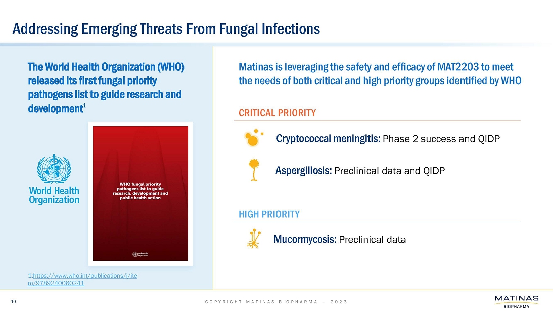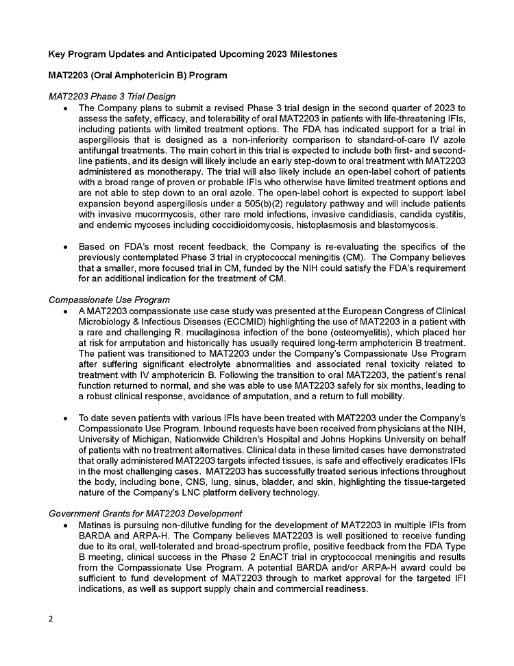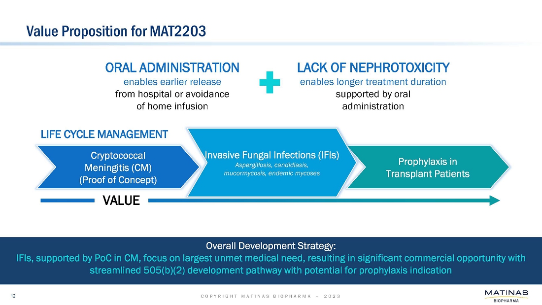 | ● | 米国食品医薬品局からの最新のフィードバックに基づき、当社は、クリプトコッカス髄膜炎(以下、「CM」)を対象としたMAT2203の以前に計画されていたフェーズ3試験を再検討しています。当社は、CMを対象としたより小規模で集中的な試験により、CMの治療に関する追加適応の規制要件を満たすことができると考えています。; |