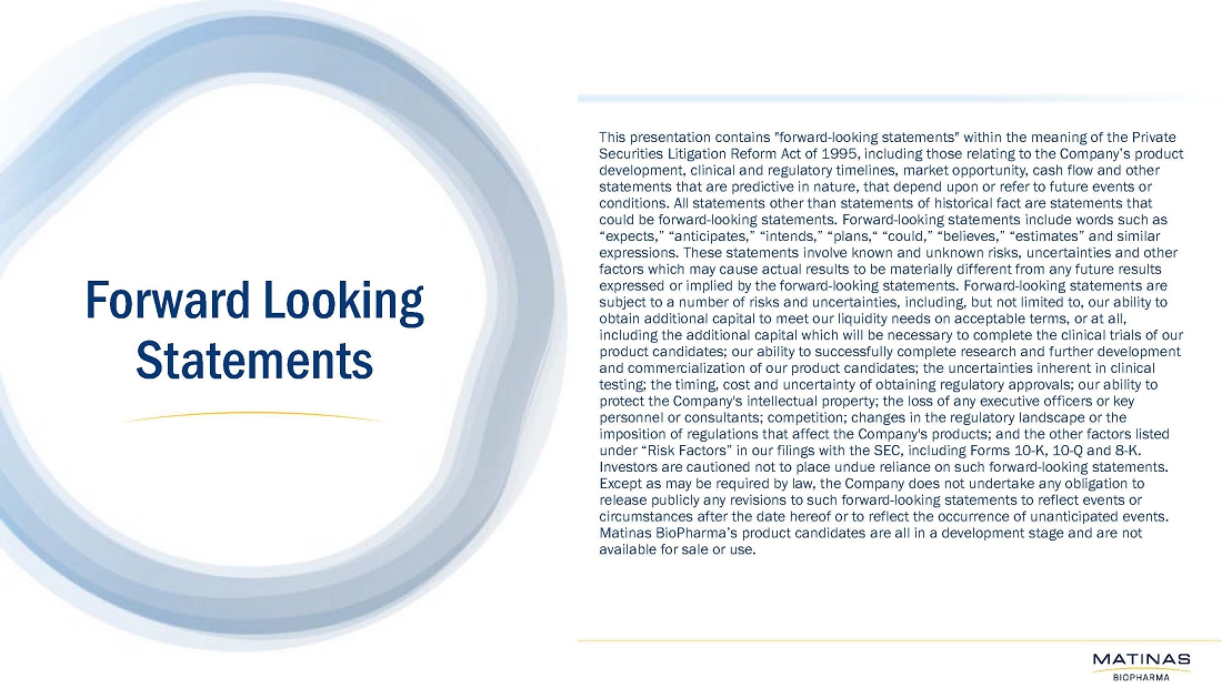 これらの記述は、「期待する」、「予想する」、「意図する」、「計画する」、「可能性がある」、「信じる」、「推定する」および同様の表現を含むが、これらに限定されない、将来予想に関する表現の使用によって識別されることがあります。これらの記述は、既知及び未知のリスク、不確実性及びその他の要因を含んでおり、実際の結果は、将来予想に関する記述によって明示的又は黙示的に示される将来の結果とは大きく異なる可能性があります。将来予想に関する記述は、以下のような多くのリスクおよび不確実性を伴いますが、これらに限定されるものではありません:当社が流動性ニーズを満たすための追加資本を許容できる条件で、または全く入手する能力(当社の製品候補の臨床試験を完了するために必要な追加資本を含む);当社の製品候補の研究および開発ならびに商業化を成功させる能力;臨床試験特有の不確実性、規制当局の承認取得の時期、費用および不確実性、当社の知的財産を保護する能力、執行役員、主要な人員またはコンサルタントの損失、競争、規制環境の変化または当社製品に影響を与える規制の賦課、ならびにフォーム10K、10Qおよび8KなどのSECへの提出書類の「リスク要因」に記載されている他の要因。投資家の皆様におかれましては、本書の日付現在においてのみ語られているこれらの将来予想に関する記述に過度の信頼を置かないようご 注意ください。法律で義務づけられている場合を除き、当社は、本書の日付後の事象や状況、または予期せぬ事象の発生を反映するために、かかる将来予想に関する記述の修正を公に発表する義務を負うものではありません。当社の製品候補はすべて開発段階にあり、販売または使用可能ではありません。