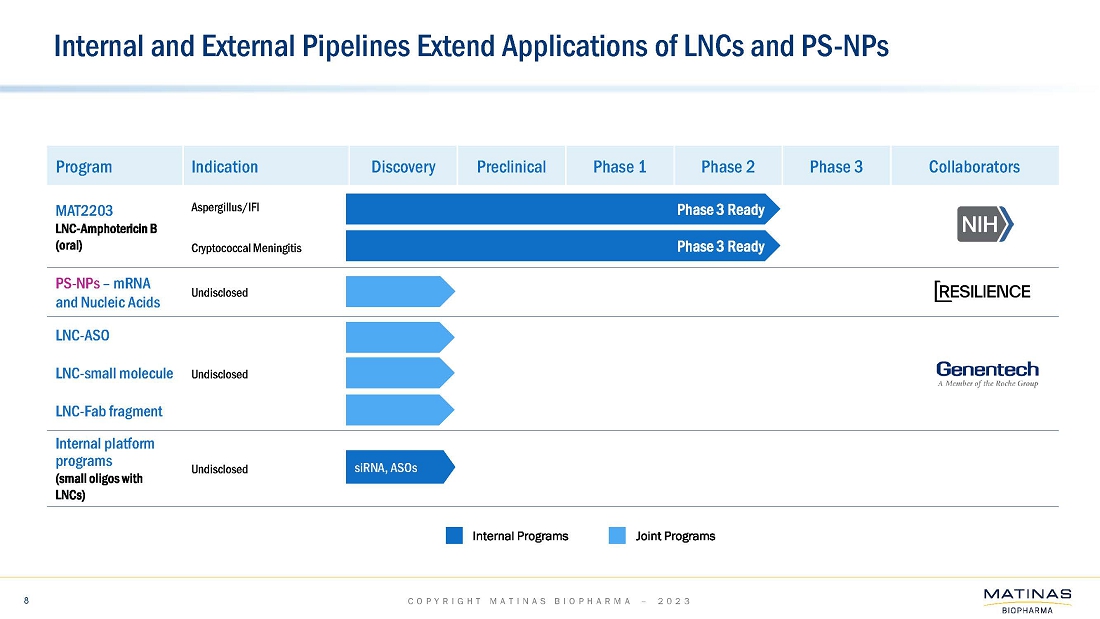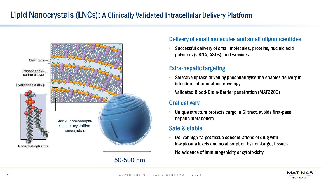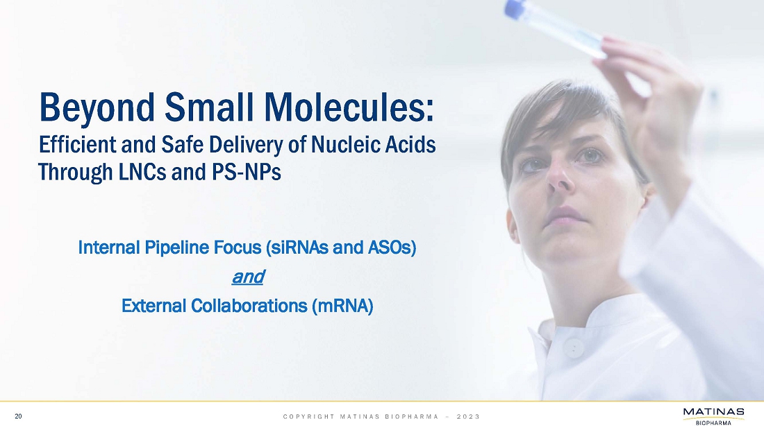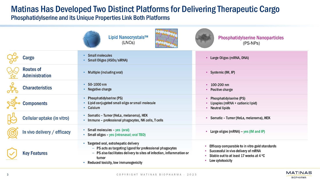 | ● | BioNTech SE社と共同で実施した経口mRNAデリバリーの最初のin vivo試験では、経口前臨床活性を示すことはできませんでした。この製剤は、健康なマウスを用いたin vivo試験に進む前に、複数の細胞株においてin vitroでmRNAを送達することに成功していました。同様の非脂質ナノ結晶(「LNC」)mRNA製剤の追加の社内in vivo試験では、全身投与(筋肉内および腹腔内)により活性が示されました。また、これらの製剤は、脂質ナノ粒子(LNP)と比較して、4℃で少なくとも17週間という高い安定性を示しています。MatinasとBioNTech SAとの共同研究は終了しました。; |