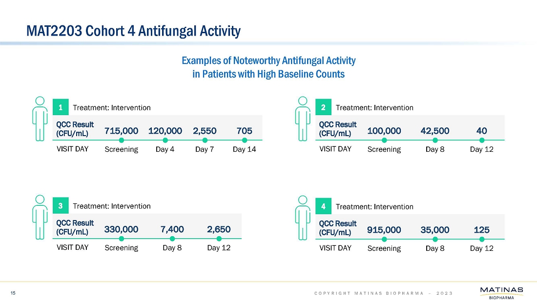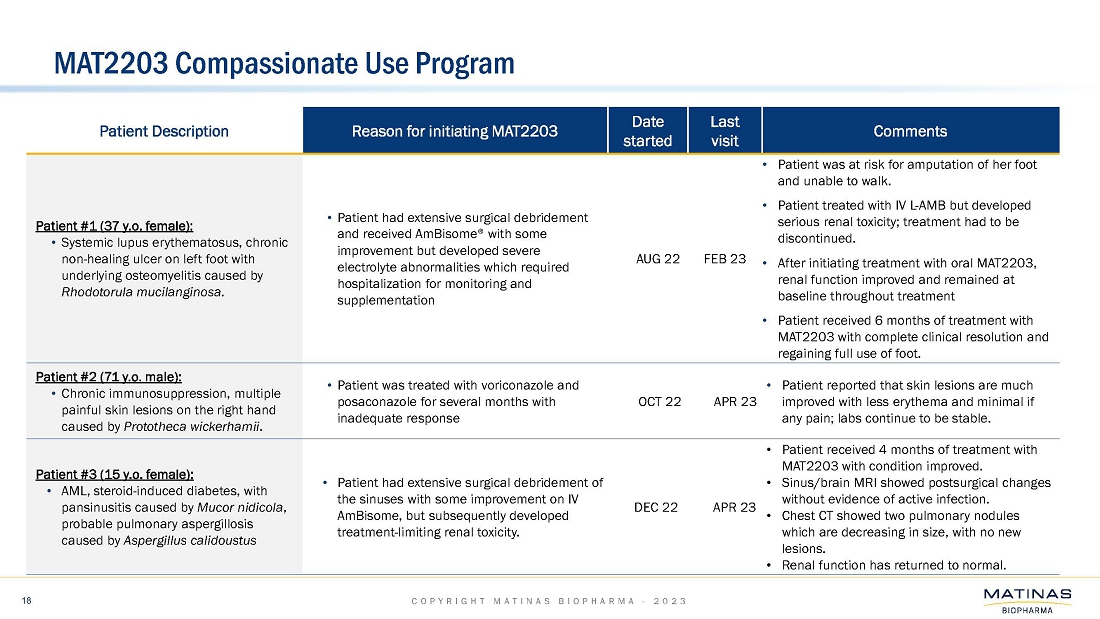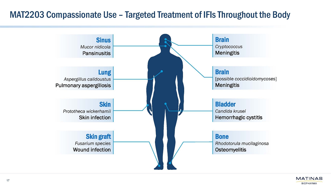 | ● | これまでに、当社のコンパッショネートユースプログラムのもと、さまざまなIFIの患者さん7名にMAT2203が投与されました。これらの限られた症例における臨床データは、経口投与されたMAT2203が標的であり、安全で、最も困難な症例のIFIを効果的に根絶することを示しました。コンパッショネートユースプログラムでは、MAT2203は、骨、中枢神経系、肺、副鼻腔、膀胱、皮膚など、全身の深刻な感染症の治療に成功しました。; |