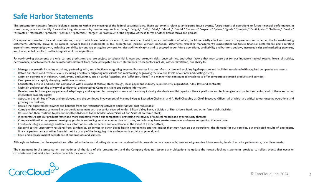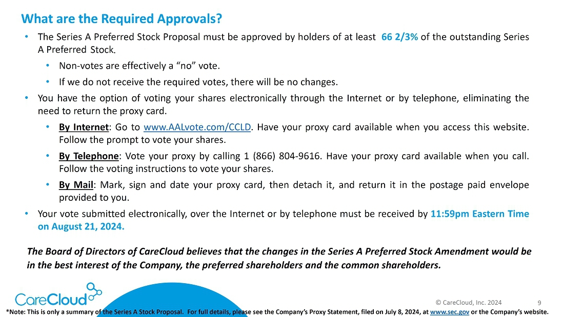 Important Additional Information and Where To Find It. CareCloud filed with the SEC a Definitive Proxy Statement on Schedule 14A on July 8, 2024, with respect to its future solicitation of proxies for the Special Meeting of Series A Preferred Shareholders (including any and all adjournments, postponements, continuations, and reschedulings thereof, the “Special Meeting”). The information contained in this press release is merely a summary of certain relevant portions of the Definitive Proxy Statement and it is important that Series A Preferred Shareholders review the entirety of the filing. SERIES A PREFERRED SHAREHOLDERS ARE URGED TO READ THE DEFINITIVE PROXY STATEMENT AND ANY OTHER AMENDMENTS OR SUPPLEMENTS FILED WITH THE SEC CAREFULLY AND IN THEIR ENTIRETY BECAUSE THEY CONTAIN OR WILL CONTAIN IMPORTANT INFORMATION ABOUT CARECLOUD’S FILING. Investors and security holders may obtain copies of these documents and other documents filed with the SEC by CareCloud free of charge through the website maintained by the SEC at www.sec.gov. The Notice of the Special Meeting of Series A Preferred Shareholders and our Definitive Proxy Statement for the Special Meeting, the Annual Report on Form 10-K for the fiscal year ended December 31, 2023 and our Quarterly Report on Form 10-Q for the quarterly period ended March 31, 2024 are available at www.sec.gov.