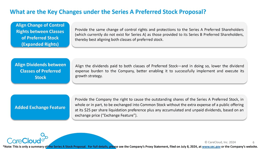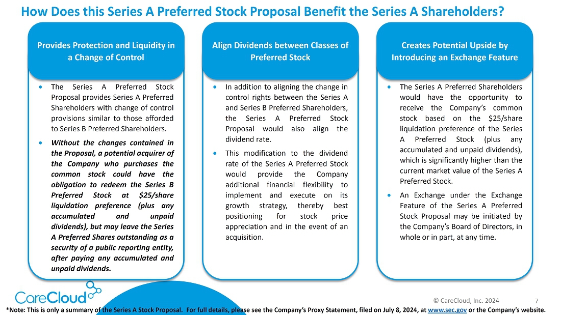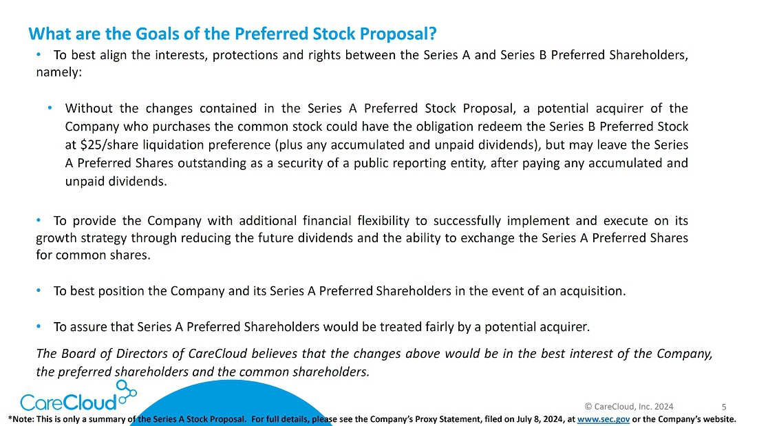 SOMERSET, N.J., July 9, 2024 (GLOBE NEWSWIRE) — CareCloud, Inc. (the “Company”) (Nasdaq: CCLD CCLDO, CCLDP), a leader in healthcare technology solutions for medical practices and health systems nationwide, today announced that it has begun soliciting proxies from the holders (the “Series A Preferred Shareholders”) of its 11% Series A Cumulative Redeemable Perpetual Preferred Stock (the “Series A Preferred Stock”) to approve an amendment to the Company’s Certificate of Designations, Preferences and Rights of 11% Series A Cumulative Redeemable Perpetual Preferred Stock (the “Preferred Stock Proposal”). Under the Preferred Stock Proposal, holders of Series A Preferred Stock would receive similar change of control protections to those afforded to holders of the Company’s 8.75% Series B Cumulative Redeemable Perpetual Preferred Stock (the “Series B Preferred Stock”). The future dividends of the Series A Preferred Stock would mirror that of the Series B Preferred Stock, and the Company would, going forward, have the right to exchange the shares of Series A Preferred Stock for shares of common stock at the liquidation preference value of $25 per share, plus any accrued and unpaid dividends.