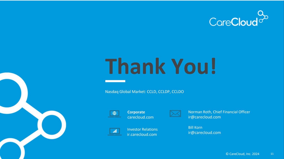 CareCloud brings disciplined innovation to the business of healthcare. Our suite of technology-enabled solutions helps clients increase financial and operational performance, streamline clinical workflows and improve the patient experience. More than 40,000 providers count on CareCloud to help them improve patient care while reducing administrative burdens and operating costs. Learn more about our products and services including revenue cycle management (RCM), practice management (PM), electronic health records (EHR), business intelligence, patient experience management (PXM) and digital health at www.carecloud.com.