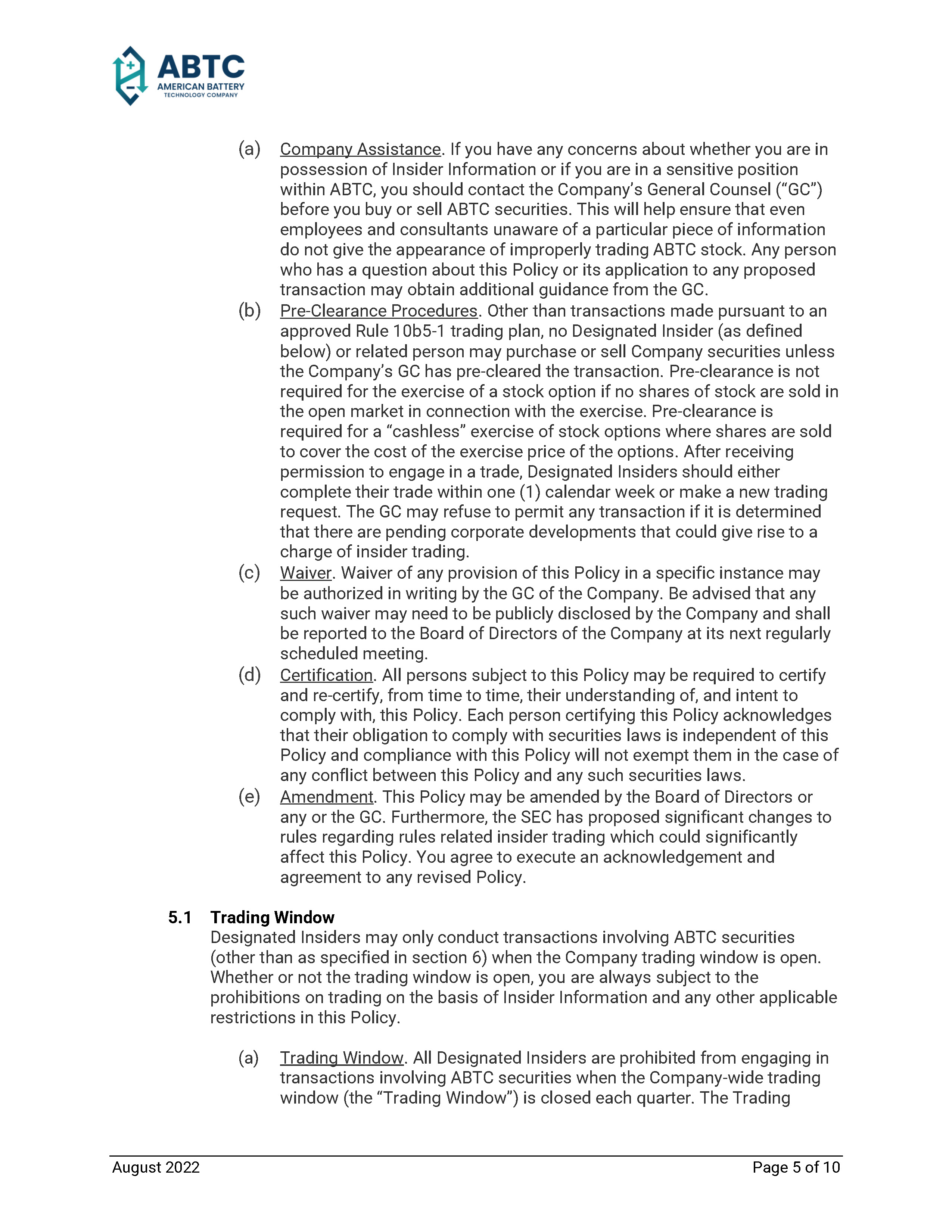 The Board of Directors (“Board”) of American Battery Technology Company (the “Company”) believes that it is in the best interests of the Company and its shareholders to adopt this policy which provides for the recoupment of certain executive compensation in the event of an accounting restatement resulting from material noncompliance with financial reporting requirements under the federal securities laws (the “Policy”). This Policy is designed to comply with Section 10D of the Securities Exchange Act of 1934, as amended (the “Exchange Act”), Rule 10D-1 promulgated under the Exchange Act (“Rule 10D-1”) and Listing Rule 5608 of The Nasdaq Stock Market LLC (“Nasdaq”).