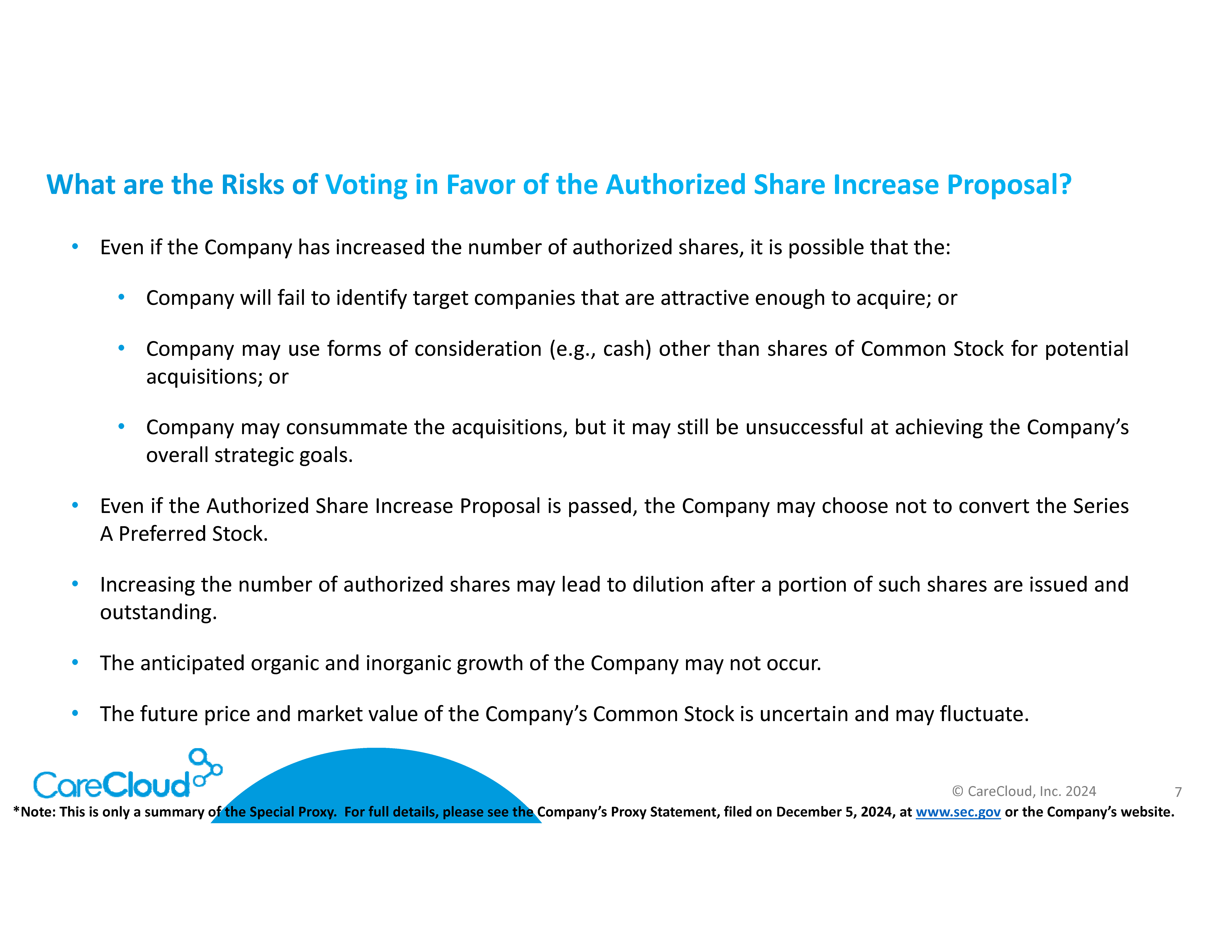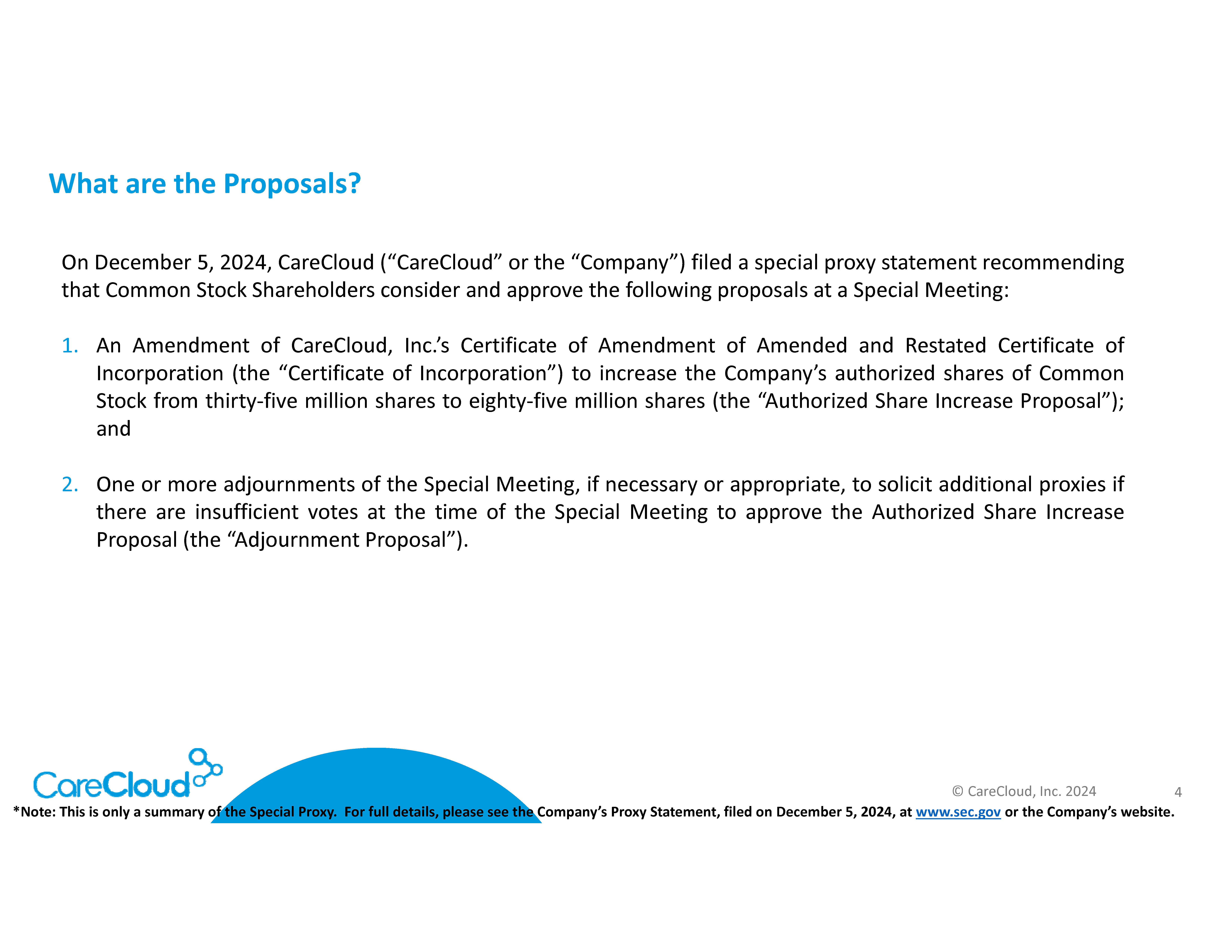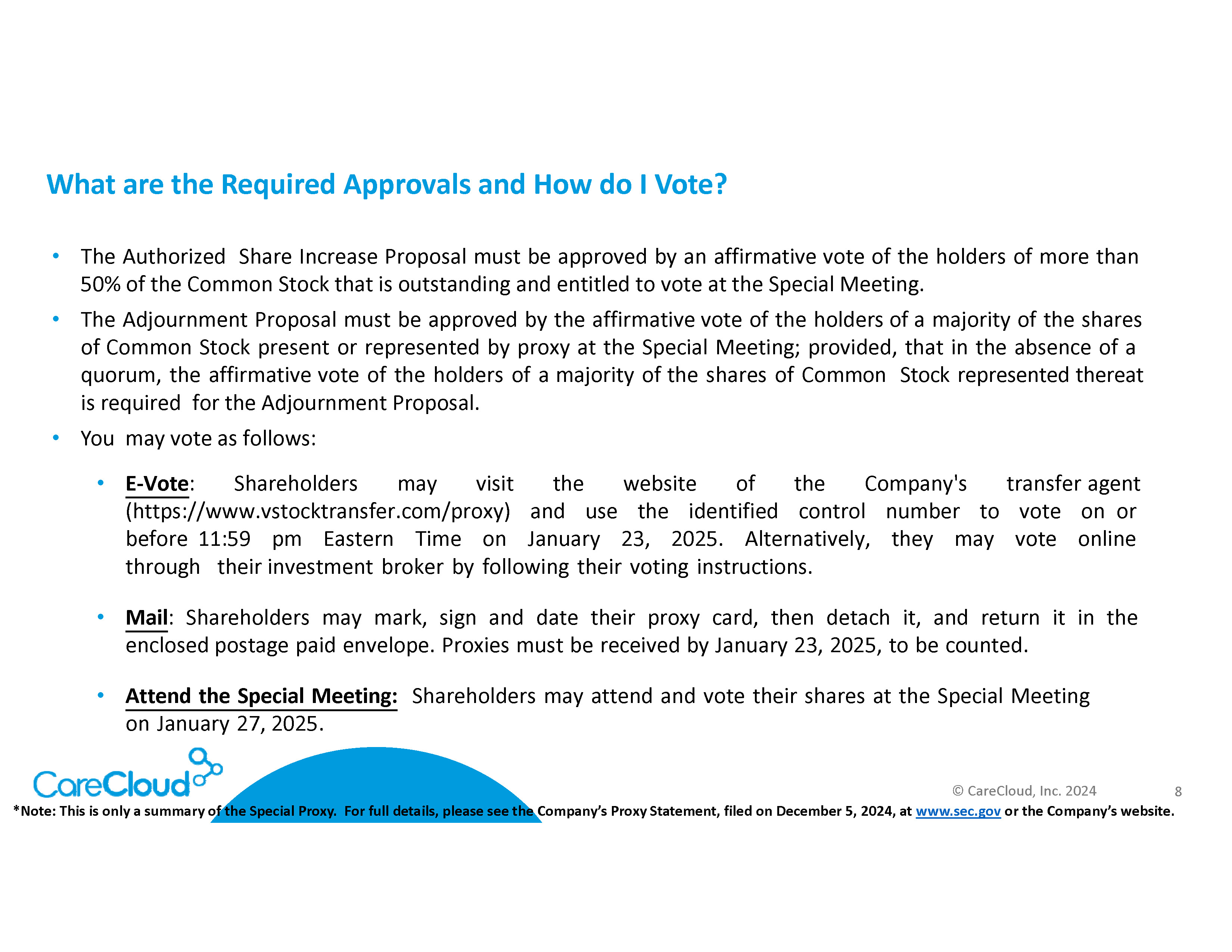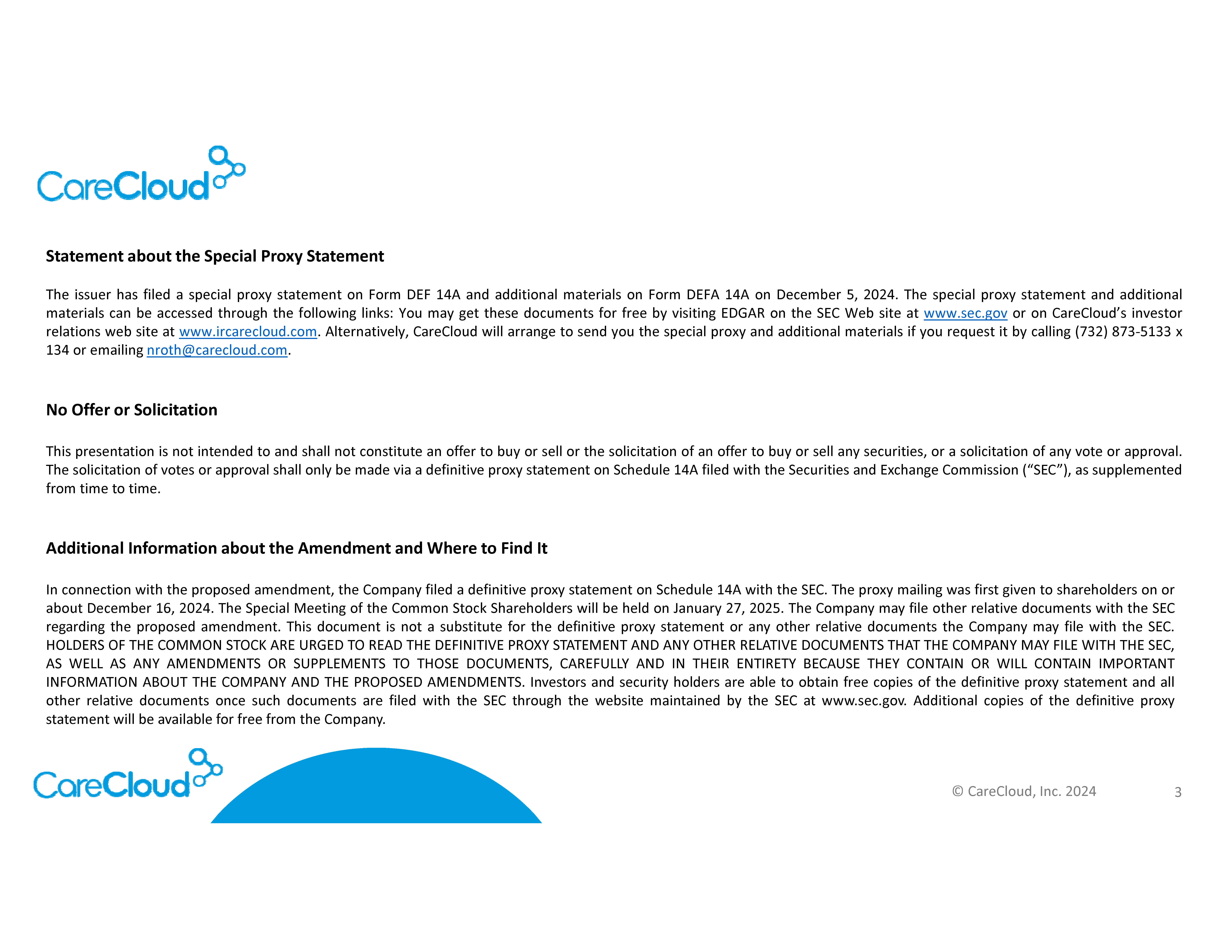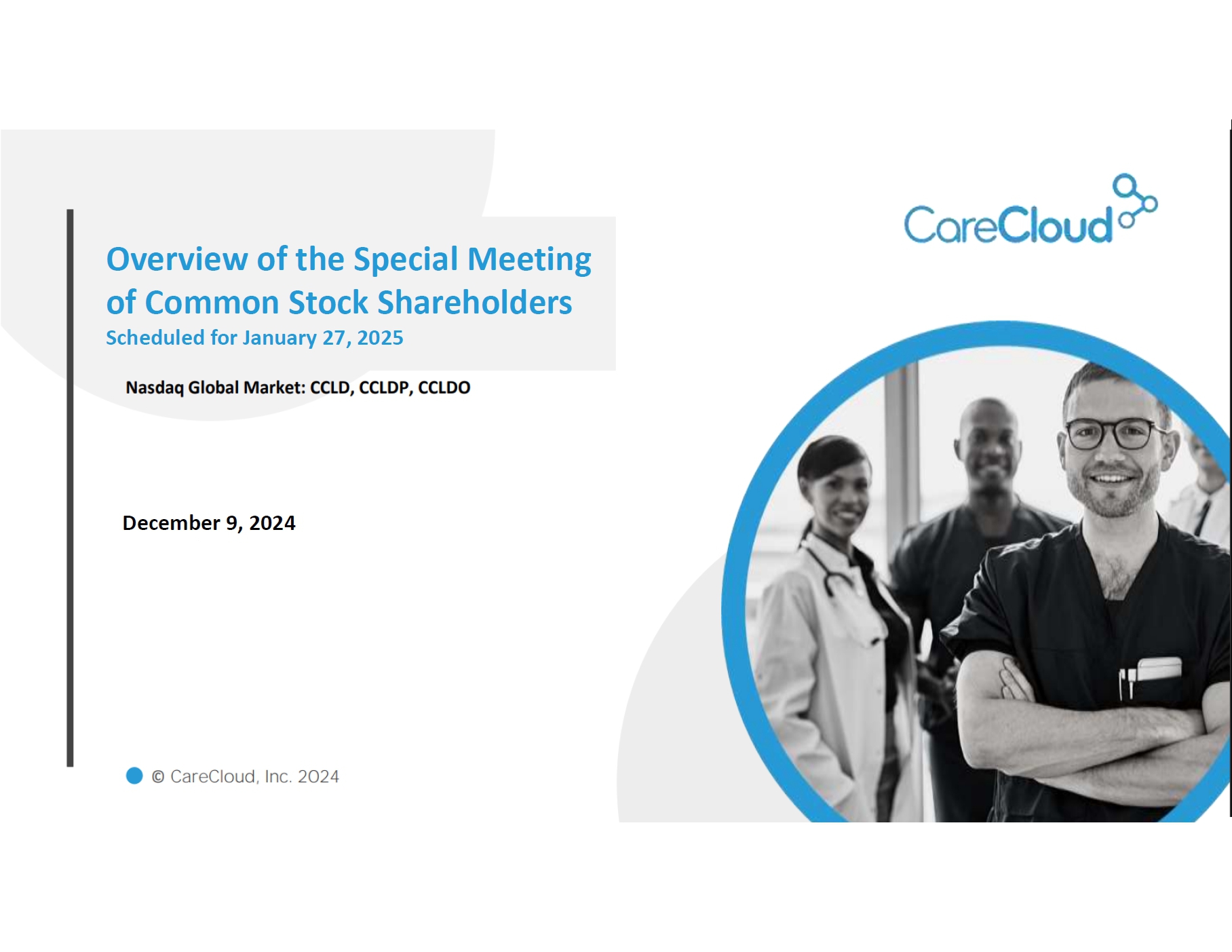 Important Additional Information and Where to Find It. CareCloud filed with the SEC a Definitive Proxy Statement on Schedule 14A on December 5, 2024, with respect to its future solicitation of proxies for the Special Meeting of Common Stock Shareholders (including any and all adjournments, postponements, continuations, and reschedulings thereof, the “Special Meeting”). The information contained in this press release is merely a summary of certain relevant portions of the Definitive Proxy Statement and it is important that shareholders review the entirety of the filing. SHAREHOLDERS ARE URGED TO READ THE DEFINITIVE PROXY STATEMENT AND ANY OTHER AMENDMENTS OR SUPPLEMENTS FILED WITH THE SEC CAREFULLY AND IN THEIR ENTIRETY BECAUSE THEY CONTAIN OR WILL CONTAIN IMPORTANT INFORMATION ABOUT CARECLOUD’S FILING. Investors and security holders may obtain copies of these documents and other documents filed with the SEC by CareCloud free of charge through the website maintained by the SEC at www.sec.gov. The Notice of the Special Meeting of Common Stock Shareholders and our Definitive Proxy Statement for the Special Meeting, the Annual Report on Form 10-K for the fiscal year ended December 31, 2023 and our Quarterly Report on Form 10-Q for the quarterly period ended September 30, 2024 are available at www.sec.gov.
