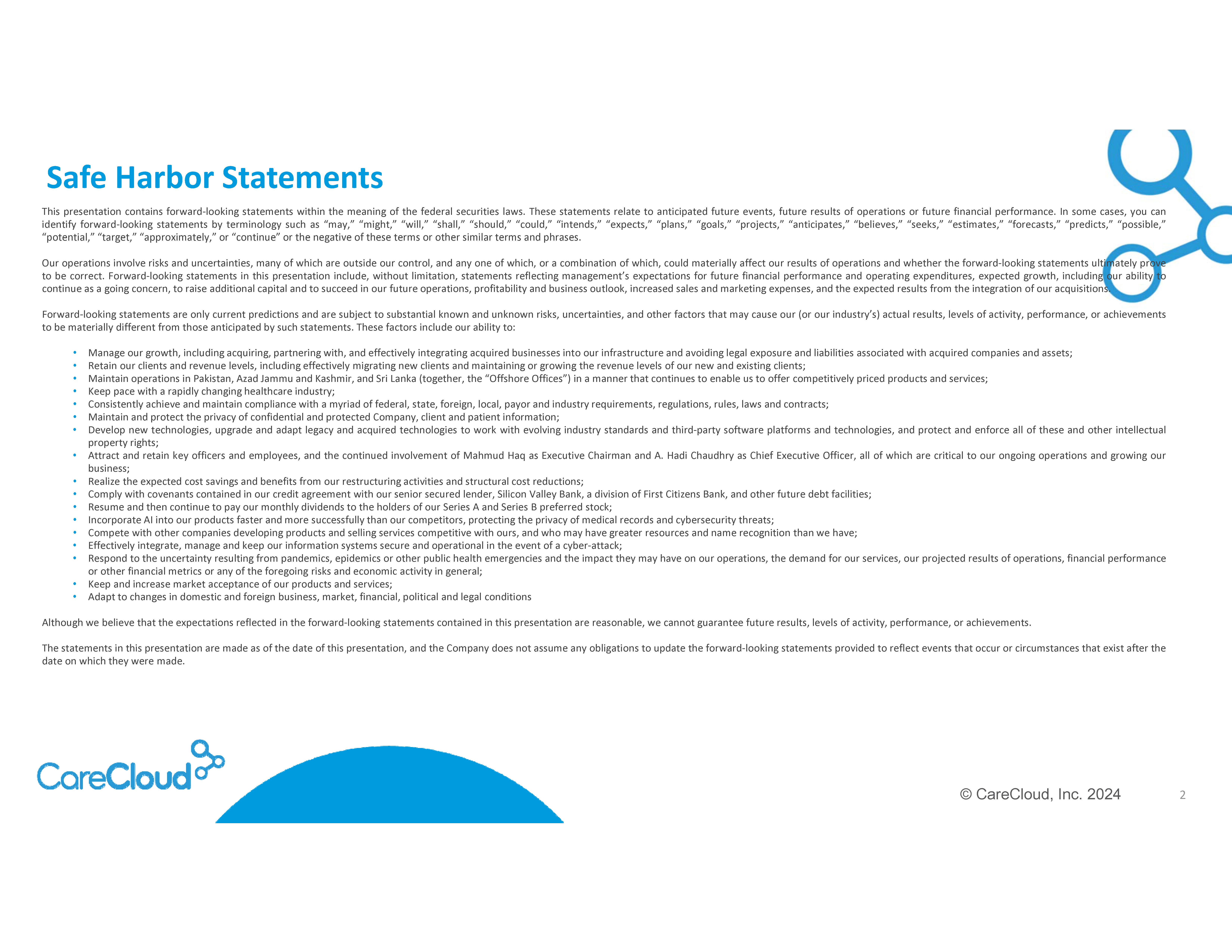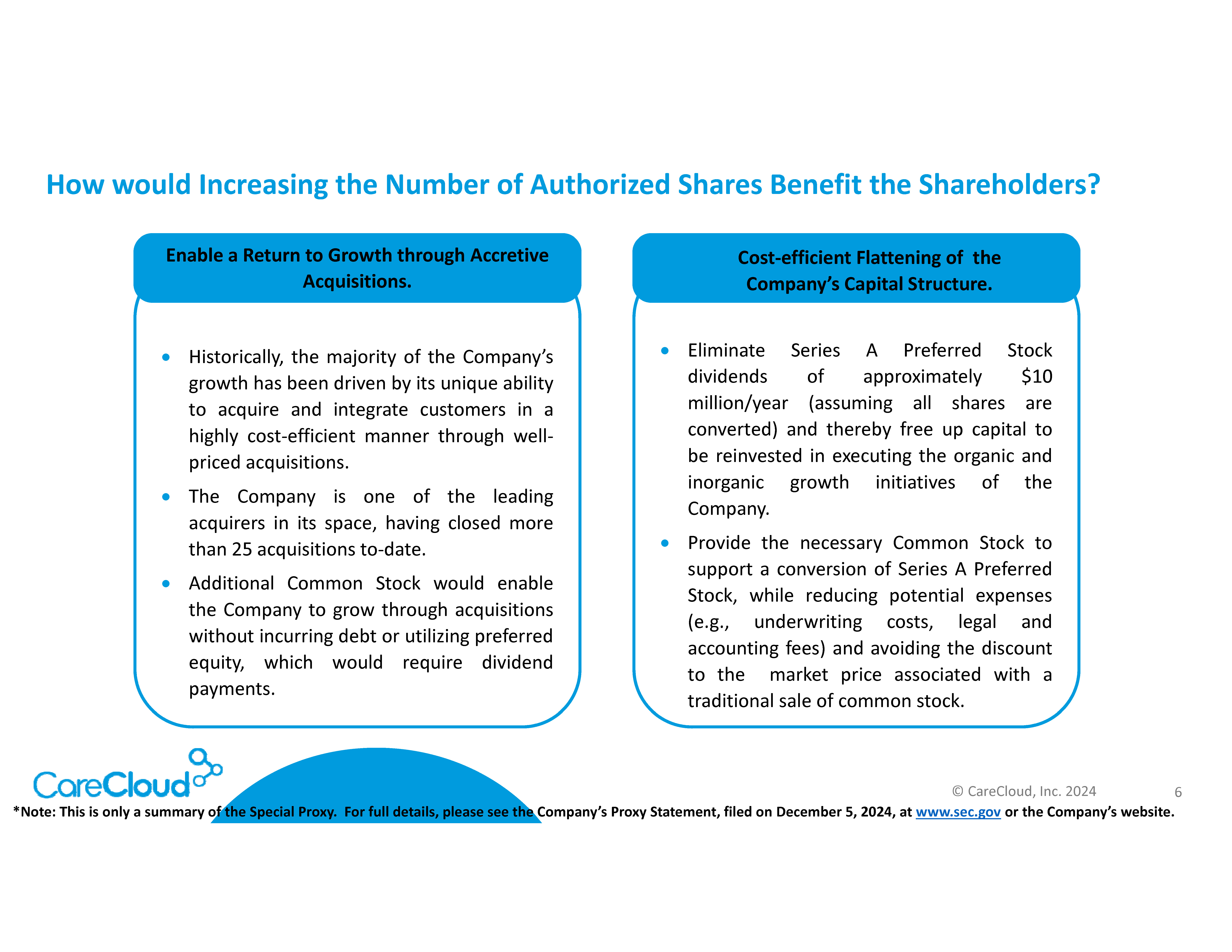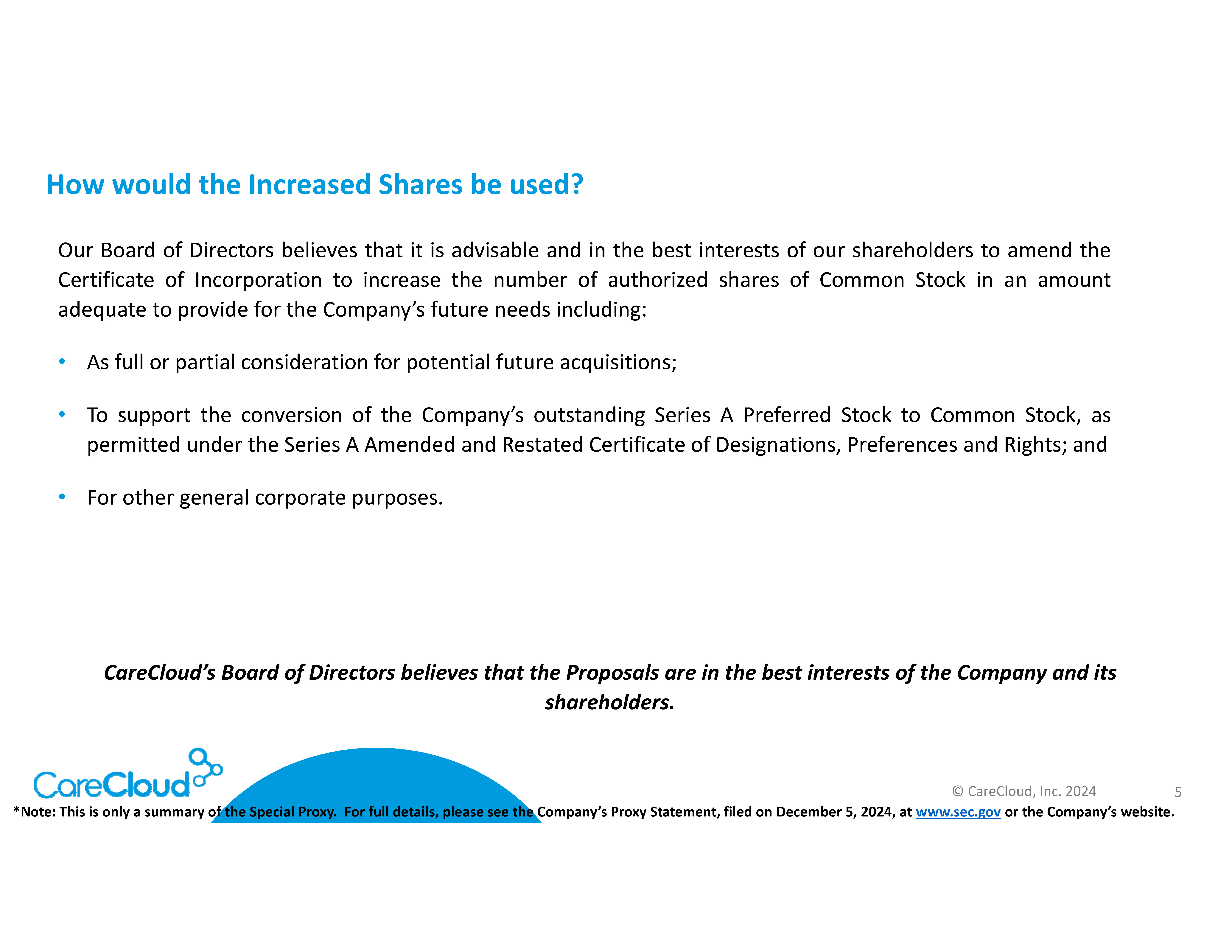 Mahmud Haq, Founder and Executive Chairman of CareCloud’s Board of Directors stated, “As CareCloud’s largest common stockholder, Founder and Executive Chairman, I enthusiastically support this proposal. Our board and executive team collectively own more than 38% of the Common Stock and we firmly believe that increasing the number of authorized shares is essential to driving our revenue and profits – empowering us to deliver sustained, double-digit growth with a simultaneous, laser-like focus on profitability.”