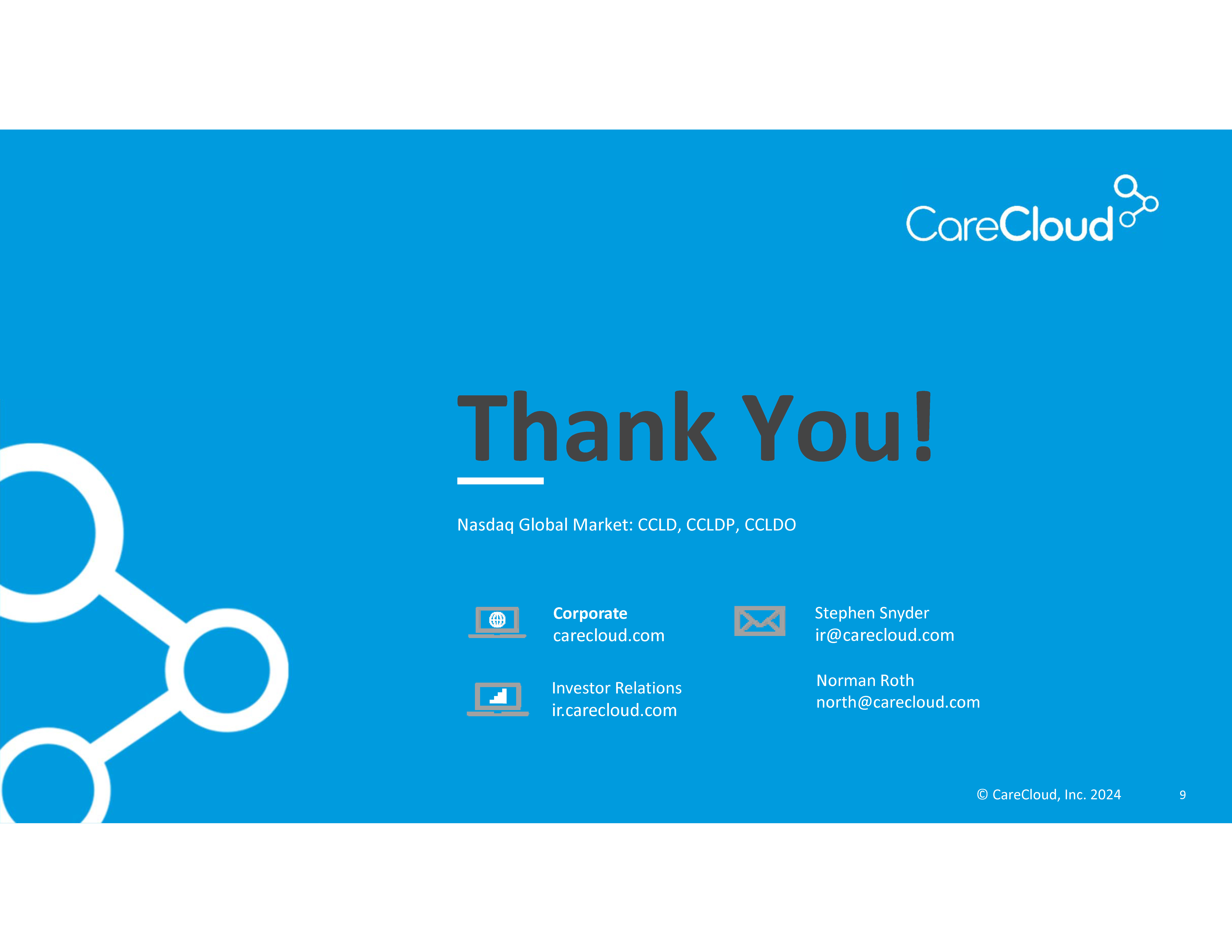 CareCloud brings disciplined innovation to the business of healthcare. Our suite of technology-enabled solutions helps clients increase financial and operational performance, streamline clinical workflows and improve the patient experience. More than 40,000 providers count on CareCloud to help them improve patient care while reducing administrative burdens and operating costs. Learn more about our products and services including revenue cycle management (RCM), practice management (PM), electronic health records (EHR), business intelligence, patient experience management (PXM) and digital health at www.carecloud.com.