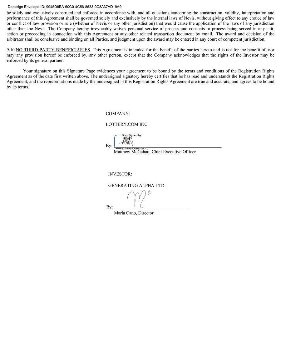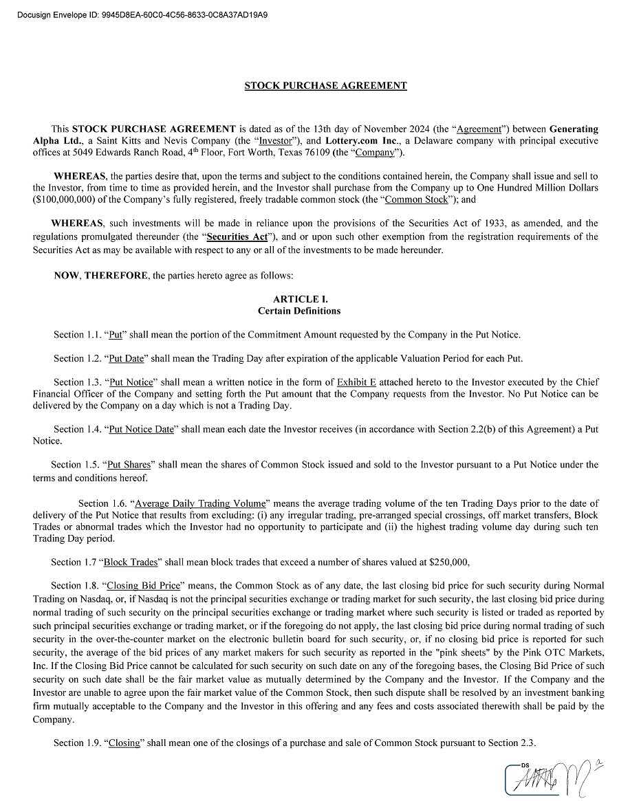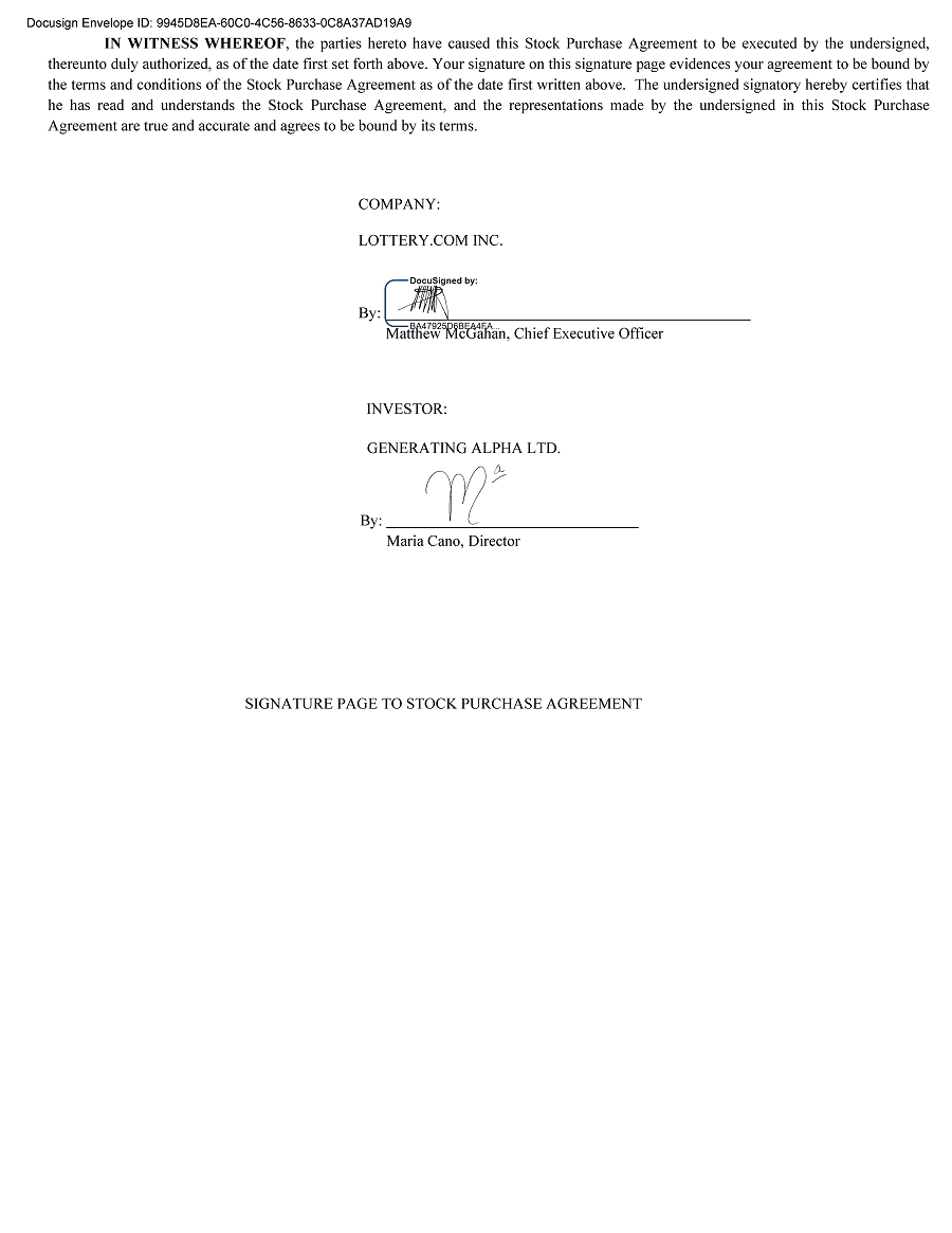 In connection with the Quarterly Report of Lottery.com Inc. (the “Company”) on Form 10Q for the quarter ended September 30, 2024, as filed with the Securities and Exchange Commission (the “Report”), I, Matthew McGahan, Principal Executive Officer of the Company, certify, pursuant to 18 U.S.C. Section 1350, as adopted pursuant to Section 906 of the Sarbanes-Oxley Act of 2002, that: