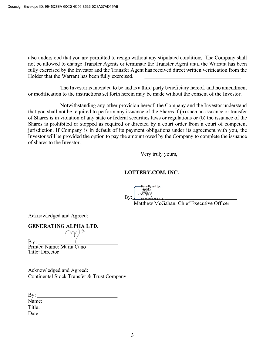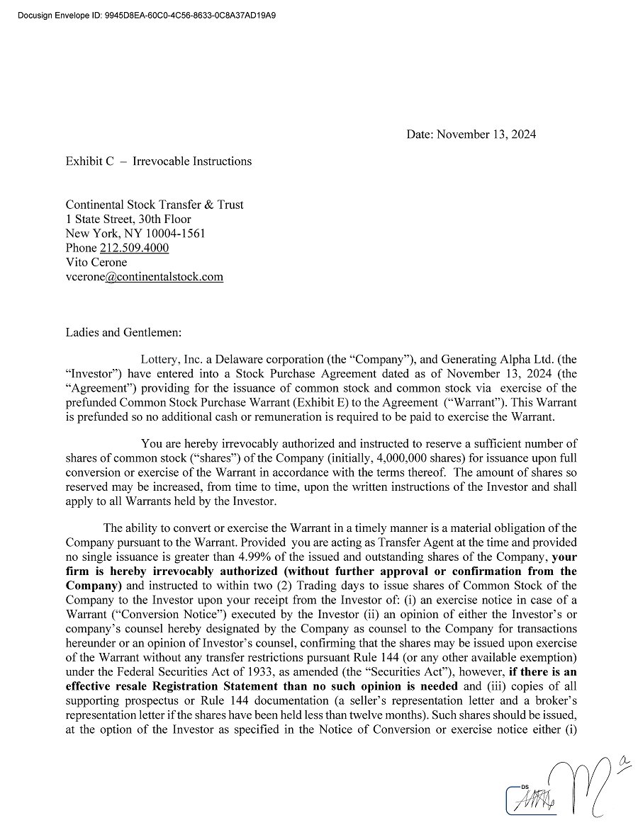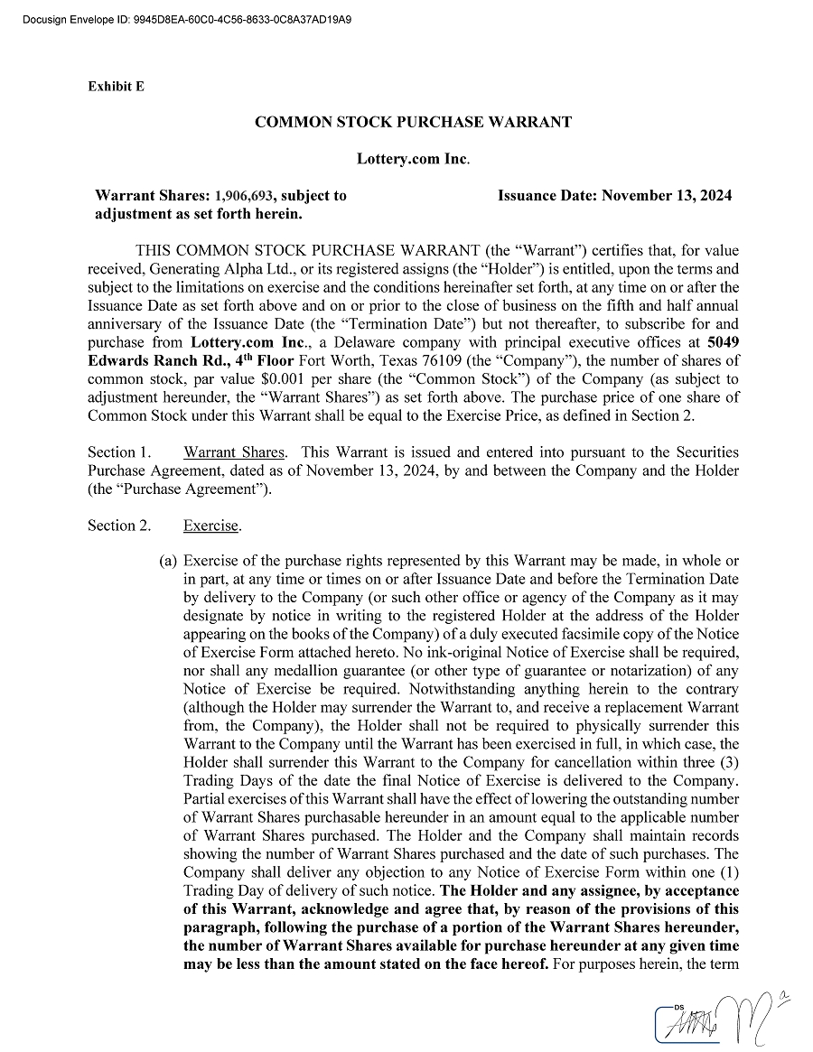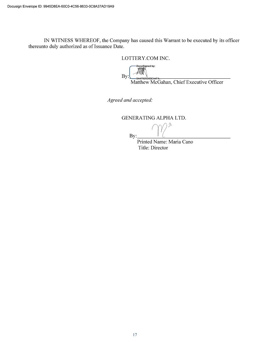 In connection with the Quarterly Report of Lottery.com Inc. (the “Company”) on Form 10Q for the quarter ended September 30, 2024, as filed with the Securities and Exchange Commission (the “Report”), I, Matthew McGahan, Principal Executive Officer of the Company, certify, pursuant to 18 U.S.C. Section 1350, as adopted pursuant to Section 906 of the Sarbanes-Oxley Act of 2002, that: