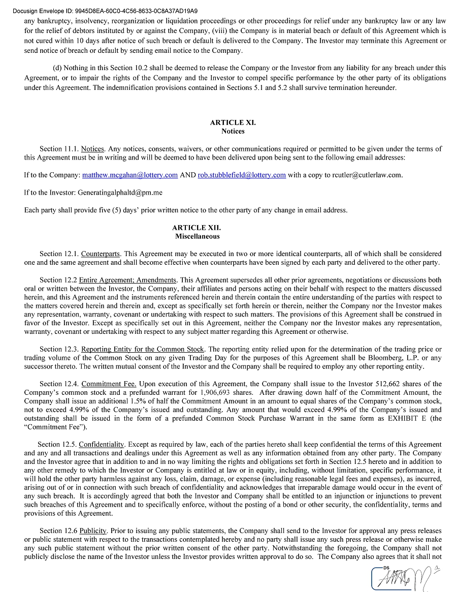 | ● | In July 2022, we furloughed the majority of our employees and suspended our lottery game sales operations after determining that we did not have sufficient financial resources to fund our operations or pay certain existing obligations, including our payroll and related obligations. As a result, we may not be able to continue as a going concern. | |