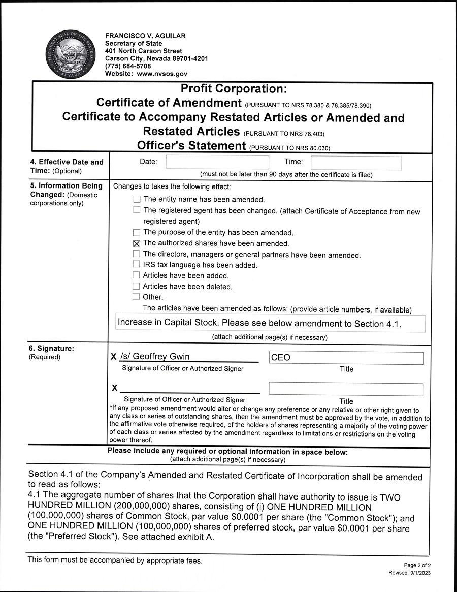 | 3.1 | Certificate of Amendment of Articles of Incorporation | |