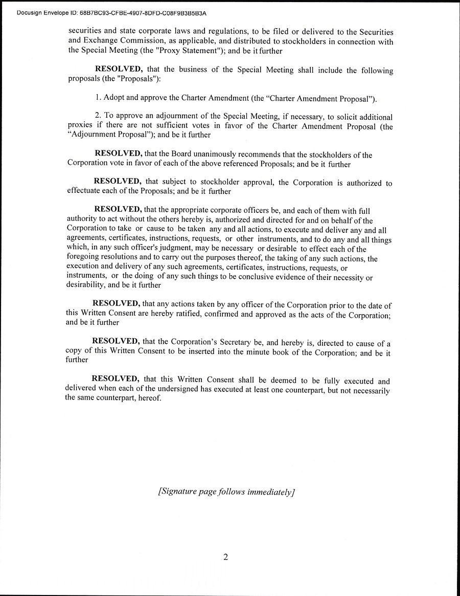 At the Meeting, the proposal to approve the adjournment of the Annual Meeting to a later date or dates, if necessary or appropriate, to permit further solicitation and vote of proxies in the event that there not sufficient votes to approve the Charter Amendment Proposal was moot as described above.