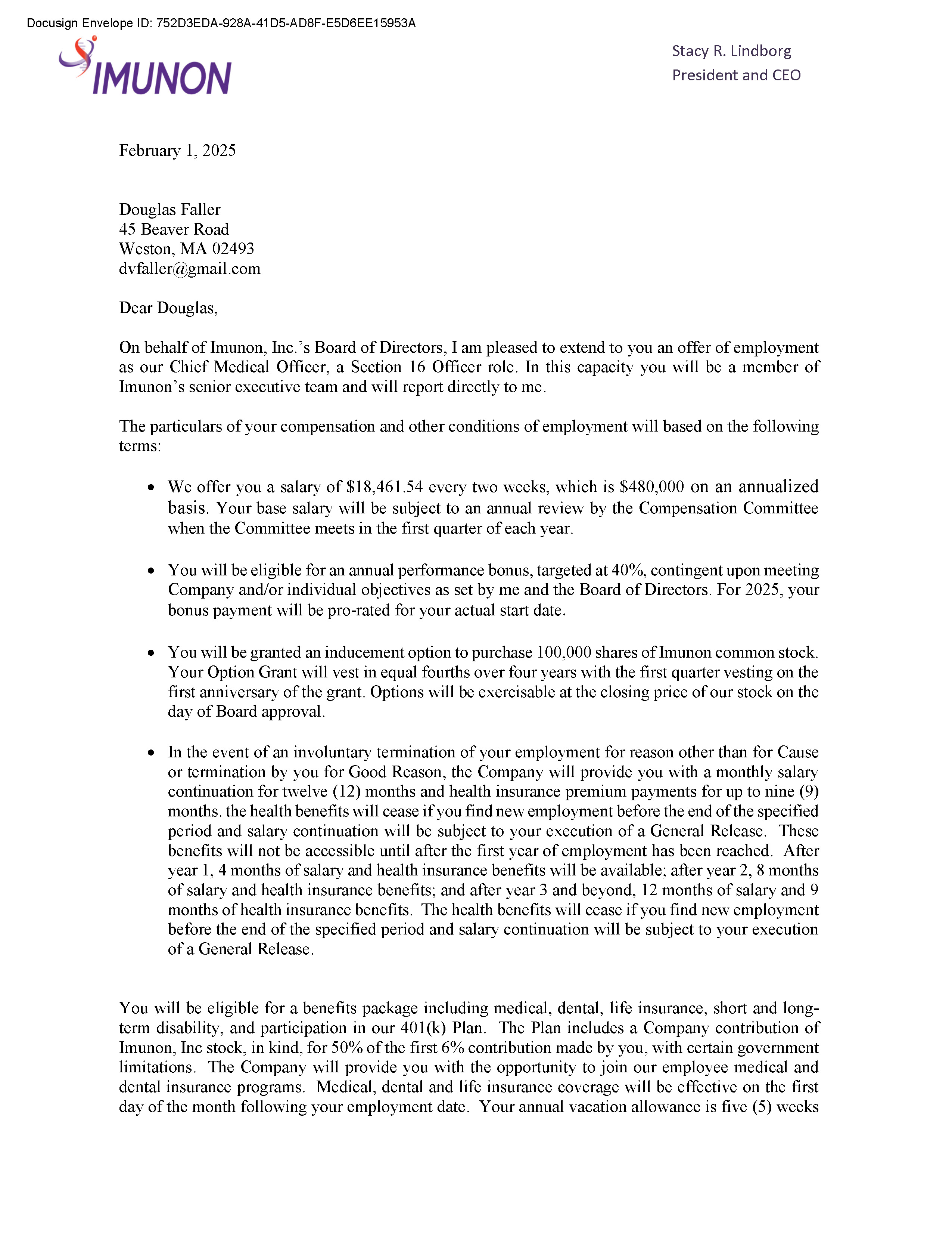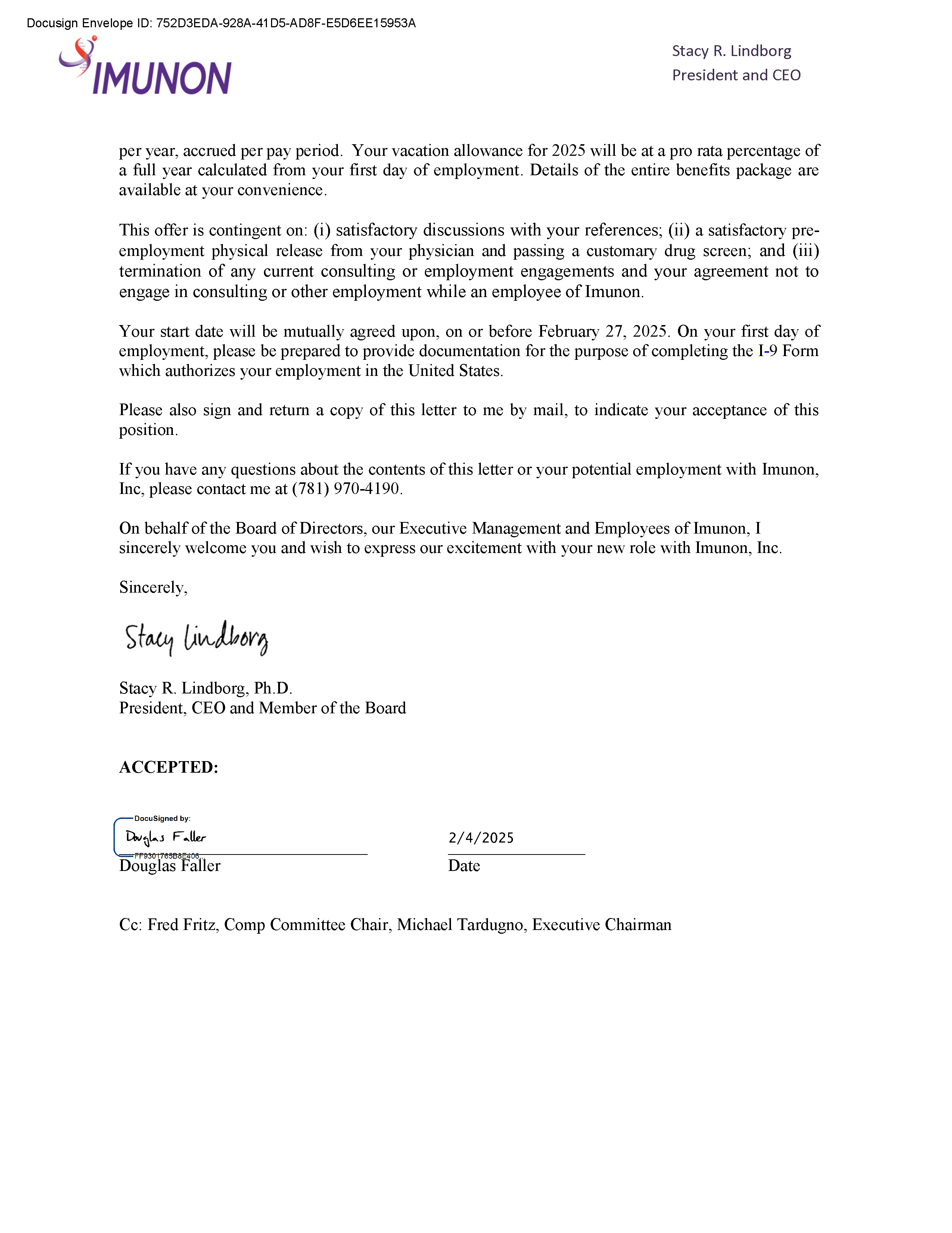 | 10.1 | Offer Letter of Employment between Imunon, Inc. and Douglas Faller | |