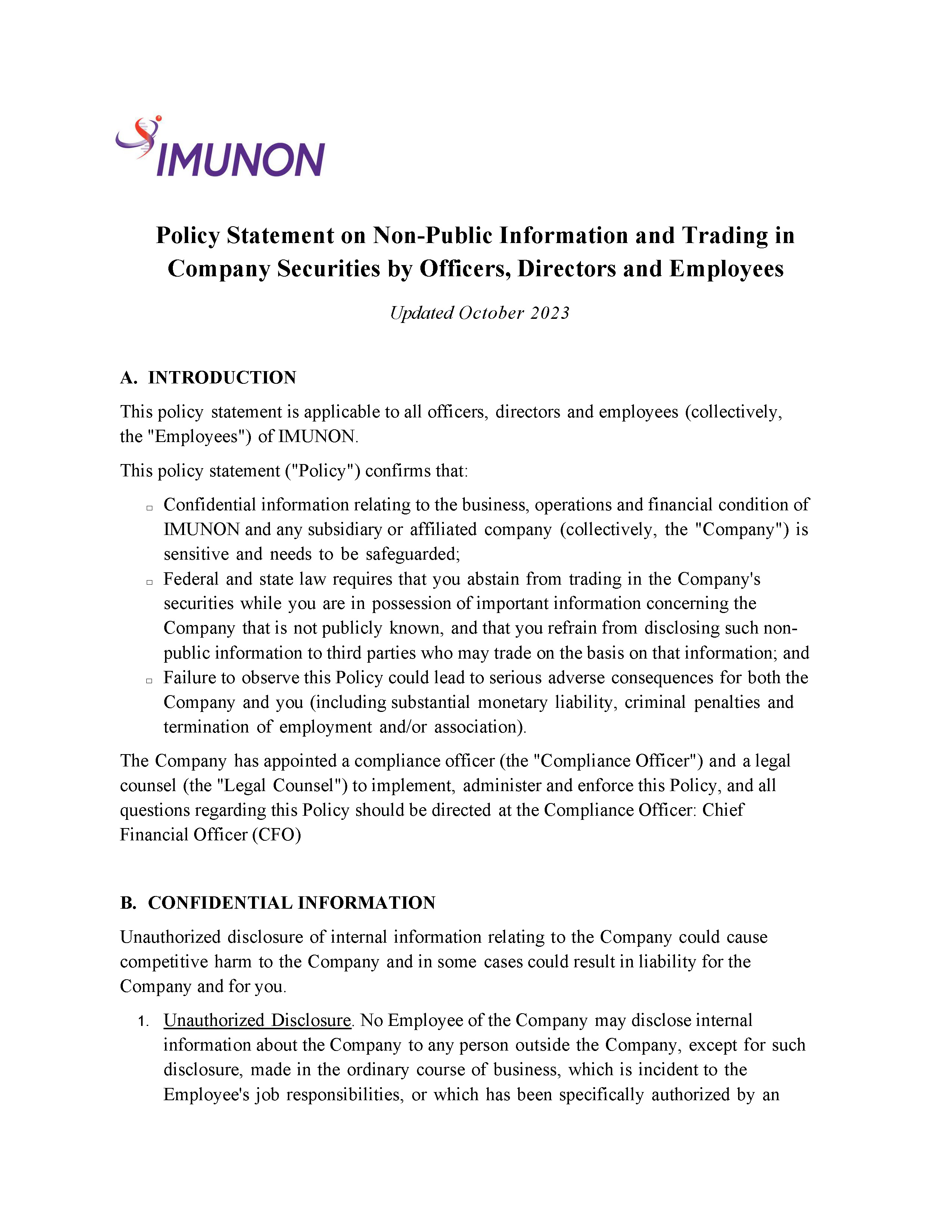 The Imunon brand and product names contained in this document are trademarks, registered trademarks or service marks of Imunon, Inc. or its subsidiary in the United States (the “U.S.”) and certain other countries. This document also contains references to trademarks and service marks of other companies that are the property of their respective owners.