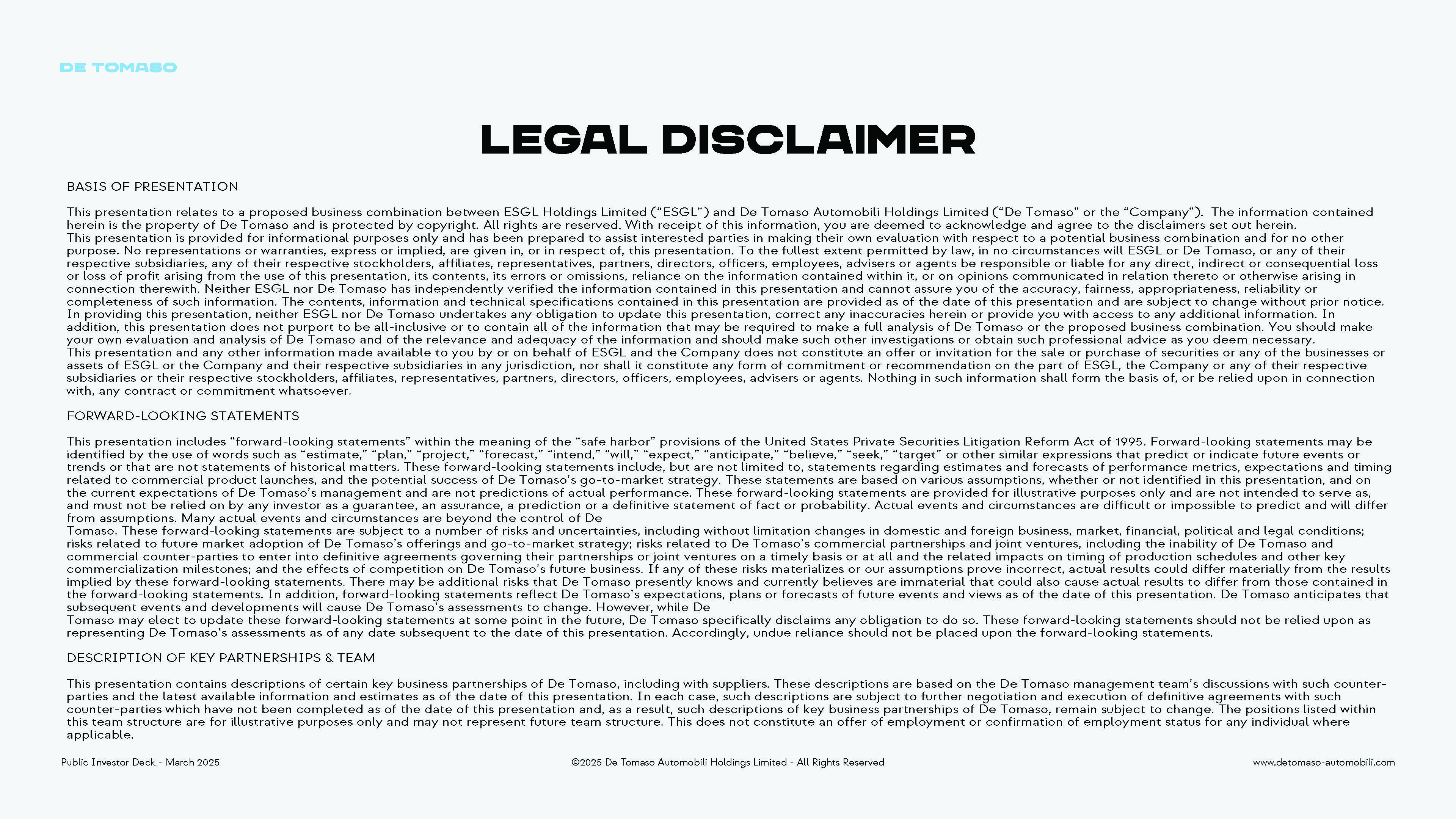 SINGAPORE, March 4, 2025 (GLOBE NEWSWIRE) — ESGL Holdings Limited (NASDAQ: ESGL) (“ESGL” or the “Company”), a leading carbon-neutral, innovative enviro-tech company regenerating spent industrial chemicals into sustainable circular products, and De Tomaso Automobili Holdings Limited (“De Tomaso Automobili”), a luxury automotive manufacturer, and the shareholders of De Tomaso Automobili have signed a definitive share purchase agreement, pursuant to which ESGL has agreed to acquire the entire issued share capital of De Tomaso Automobili in exchange for the issuance of newly issued ordinary shares of ESGL, subject to certain closing conditions being satisfied.