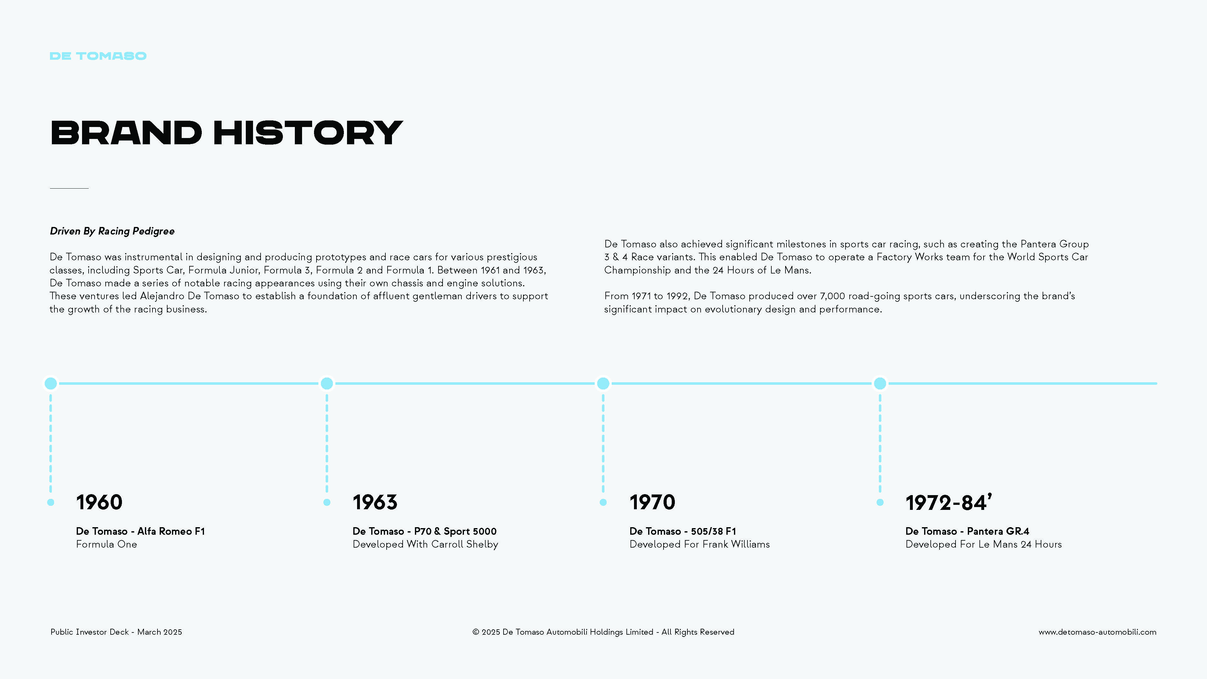 De Tomaso Automobili is a renowned Italian high-performance automotive brand, celebrated for iconic models like the Pantera and the P72. With a legacy spanning over 65 years, De Tomaso Automobili remains dedicated to luxury, cutting-edge design, and exceptional performance.