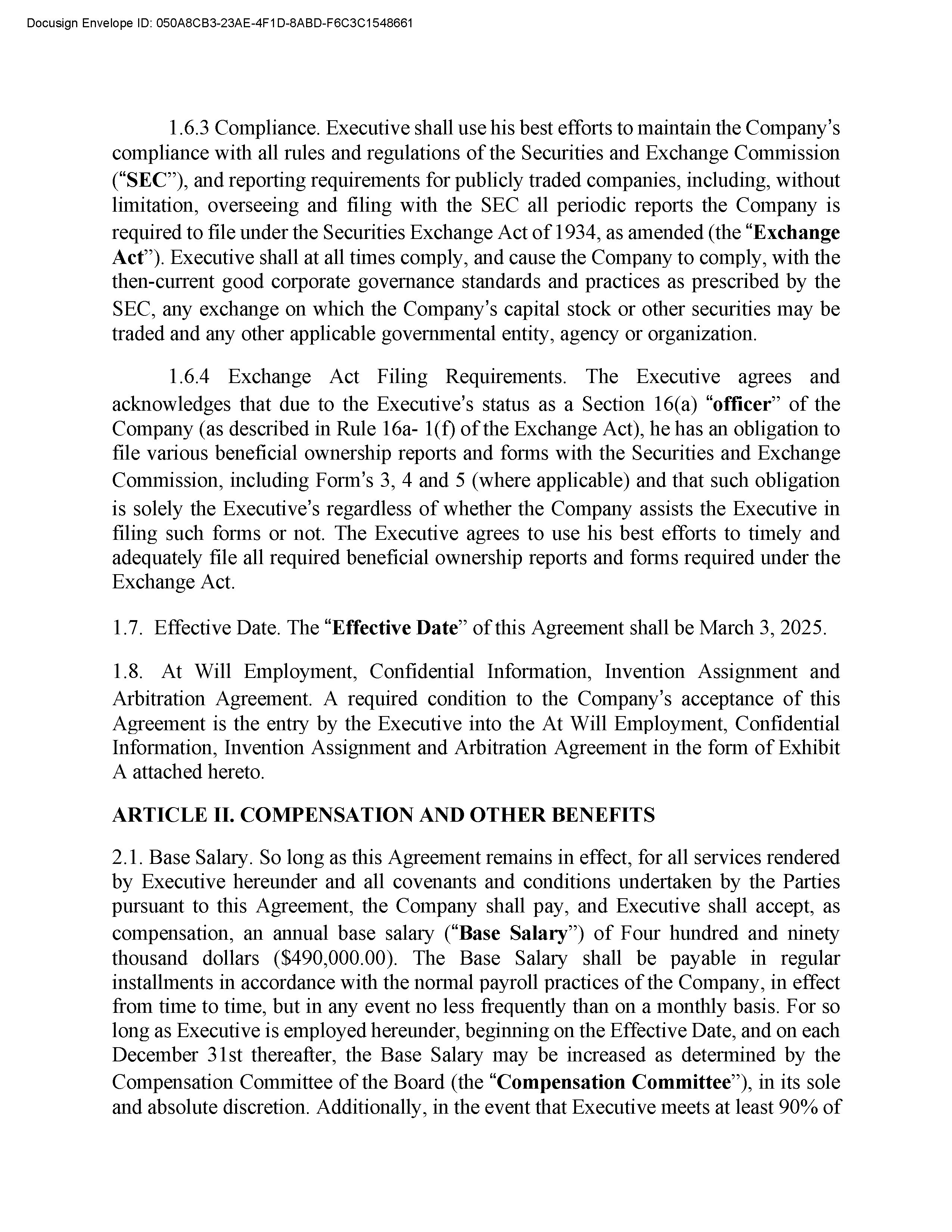 In connection with his appointment as Chief Executive Officer, effective as of the Effective Date, the Company and Mr. Norton entered into an employment agreement (the “Norton Employment Agreement”) that provides for an annual base salary of $490,000. Mr. Norton’s base salary may increase as determined by the Compensation Committee of the Company’s Board of Directors (the “Compensation Committee”) in its sole discretion, and will increase by 5% in the event Mr. Norton meets at least 90% of certain annual performance metrics established by the Compensation Committee. Furthermore, Mr. Norton is eligible for a performance based bonus of up to 100% of his base salary as determined by the Compensation Committee that is contingent upon the achievement of certain performance objectives and a yearly discretionary cash stock or equity bonus in an amount determined by the Compensation Committee. The Norton Employment Agreement provides an automobile allowance of $1,000 per month and a relocation allowance of $15,000. On the Effective Date, Mr. Norton will be granted Restricted Stock Units (“RSU”) Awards of 9,000,000 shares of the Company’s common stock that vest over three years in equal amounts contingent upon the Company realizing certain gross revenue and gross profit targets. In the event that Mr. Norton resigns for “good reason” or is terminated by the Company without “cause,” each as defined in the Norton Employment Agreement, or a change of control takes place, all outstanding and unvested RSUs will immediately accelerate and vest in full. Under the Norton Employment Agreement, Mr. Norton will be eligible for other employee benefits in accordance with the Company’s policies and plans. Mr. Norton’s employment agreement is filed as Exhibit 5.1 hereto and is incorporated herein by reference.
