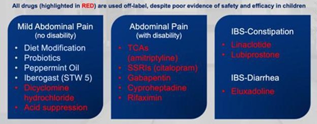 | ● | A study published in 2021 demonstrates insufficient evidence for the use of medications in pediatric functional abdominal pain disorders. This lack of evidence for drugs has been supported in by the American Academy of Pediatrics and NASPGHAN. | |