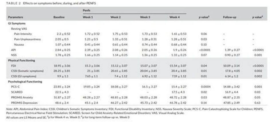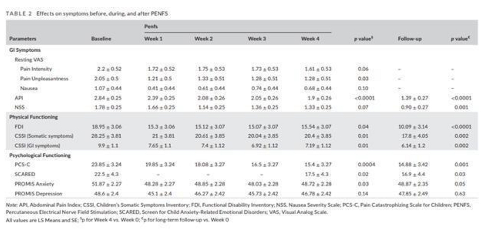 Santucci NR, King C, El-Chammas KI, Wongteerasut A, Damrongmanee A, Graham K, Fei L, Sahay R, Jones C, Cunningham NR, Coghill RC. Effect of percutaneous electrical nerve field stimulation on mechanosensitivity, sleep, and psychological comorbidities in adolescents with functional abdominal pain disorders. Neurogastroenterol Motil. 2022;34:e14358.