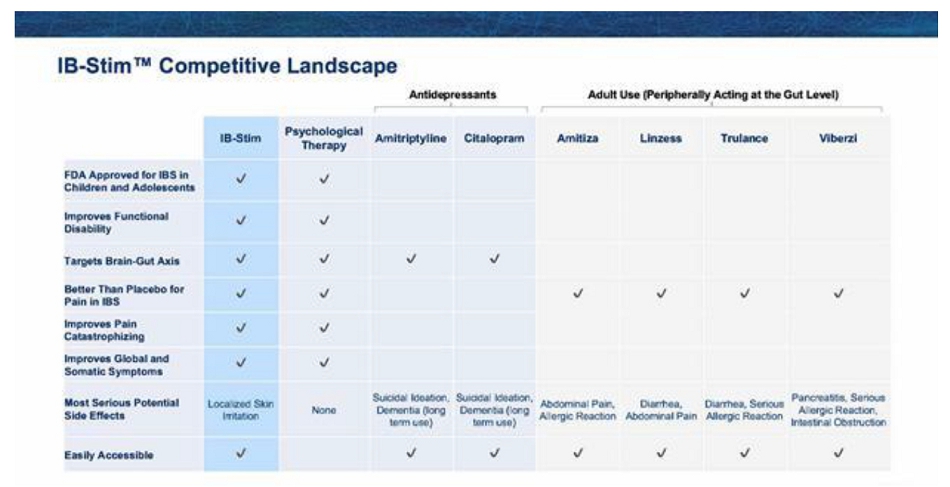 | ● | IB-Stim is the only medical therapy that has shown to improve pain, global symptoms, and functional disability in children with FAP and IBS. | |