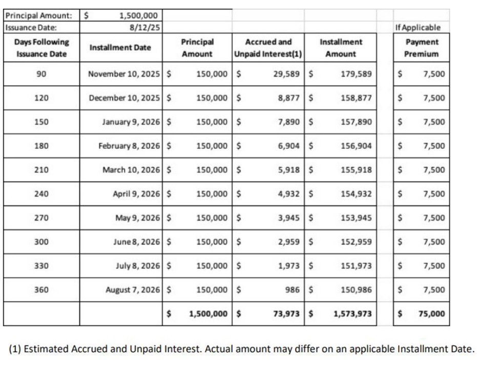 (a) Maturity Date. On the Maturity Date, the Company shall pay to the Holder an amount in cash representing all outstanding Principal, accrued and unpaid Interest, and any other amounts outstanding pursuant to the terms of this Note. The “Maturity Date” shall be August 12, 2026, as may be extended with the prior written consent of the Holder.