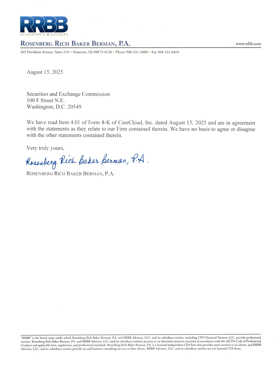On August 14, 2025, CareCloud, Inc. (the “Company”) was notified by Rosenberg Rich Baker Berman, P.A. (“RRBB”) of its resignation as the Company’s independent registered public accounting firm as they lacked the staffing capacities to perform the attestation required by SOX Section 404(b) due to the Company’s public float exceeding $75 million as of June 30, 2025.