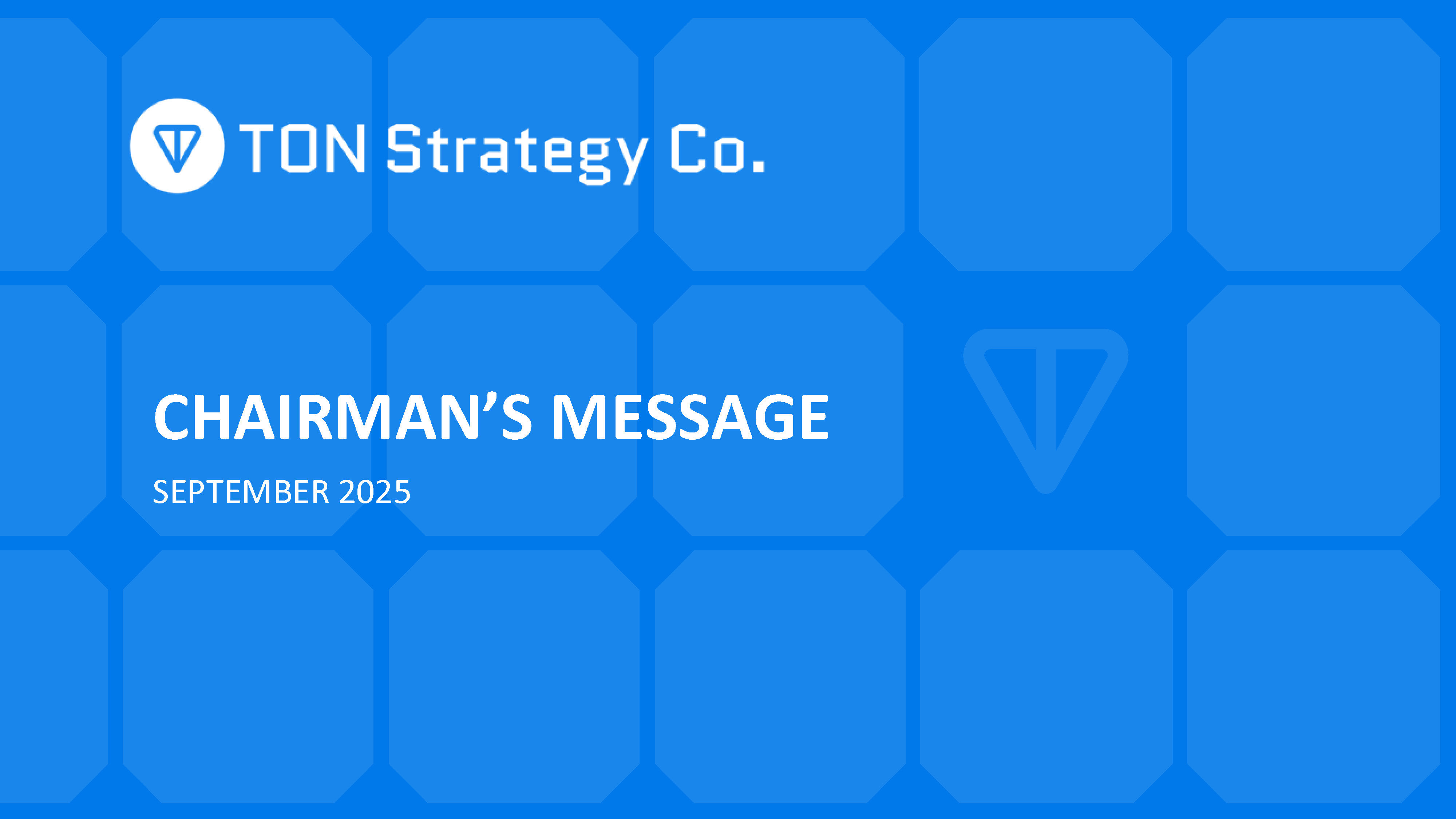 LAS VEGAS – September 5, 2025 – TON Strategy Company (Nasdaq: TONX) (the “Company”), a digital asset treasury company committed to holding Toncoin ($TON), today announced that it has published the video and presentation slides of Executive Chairman Manuel Stotz’s first Chairman’s Message. The message provides an update on the Company’s strategy and the broader $TON ecosystem, and is available for viewing on the Company’s website, https://www.tonstrat.com/.