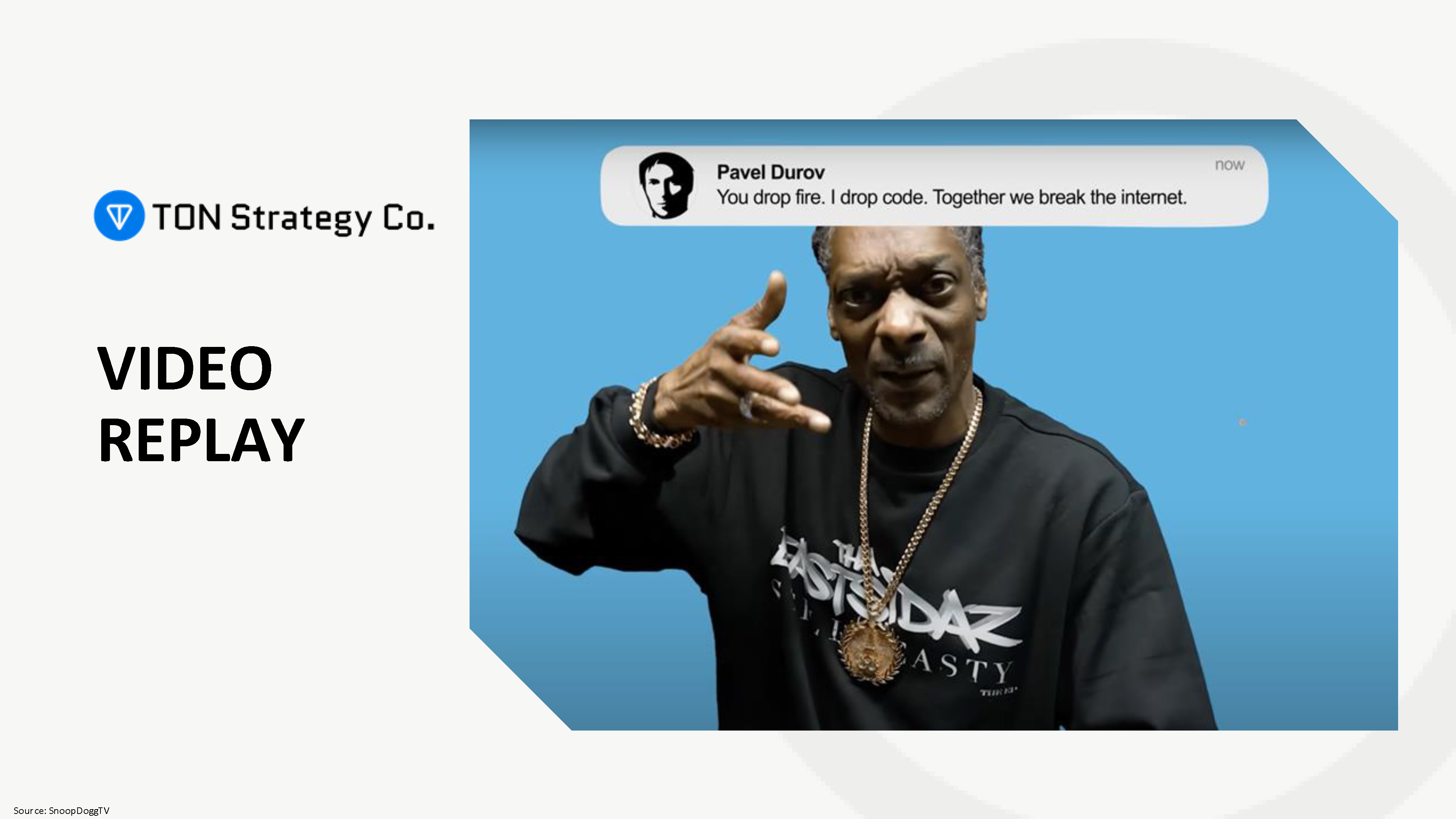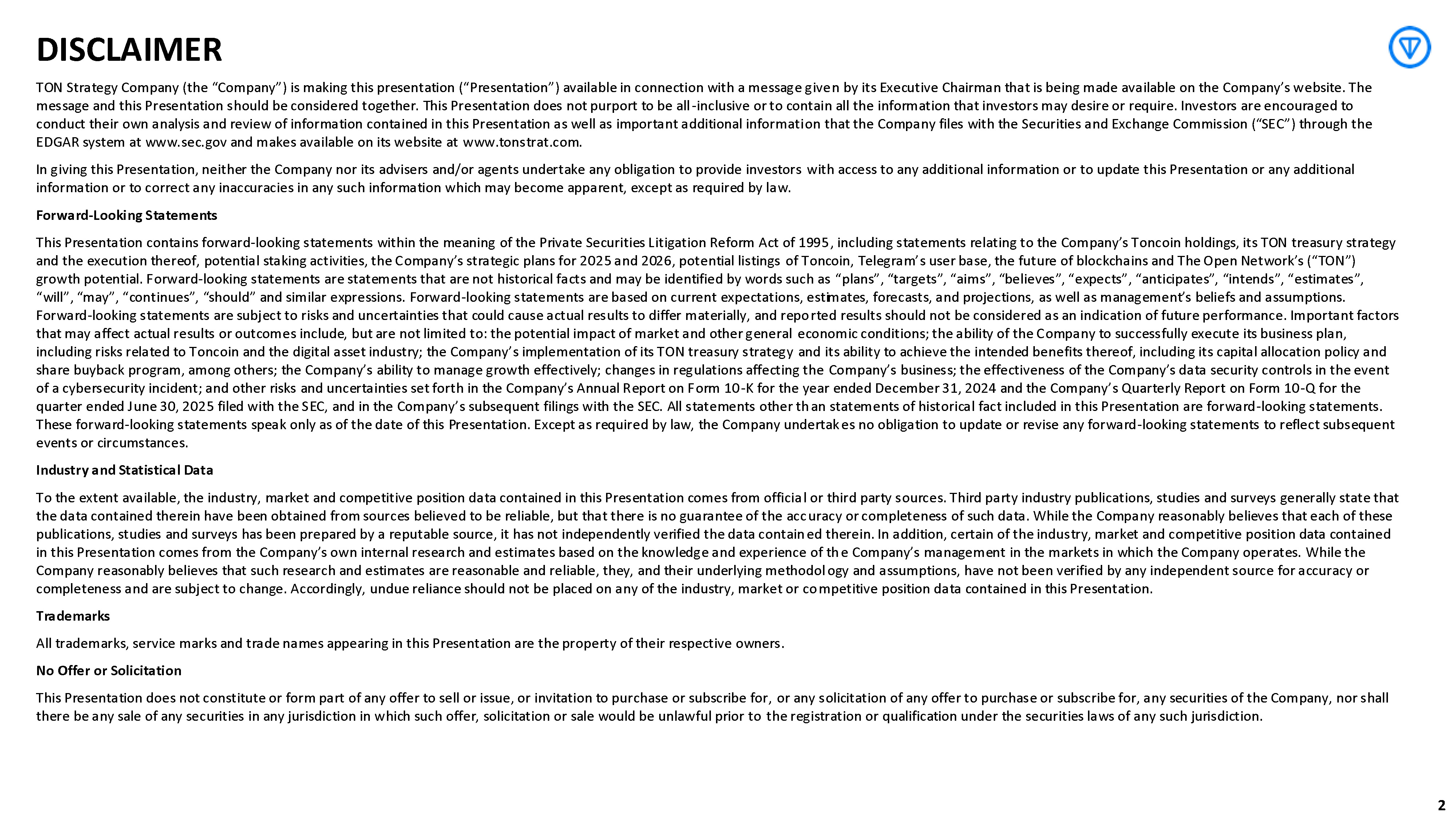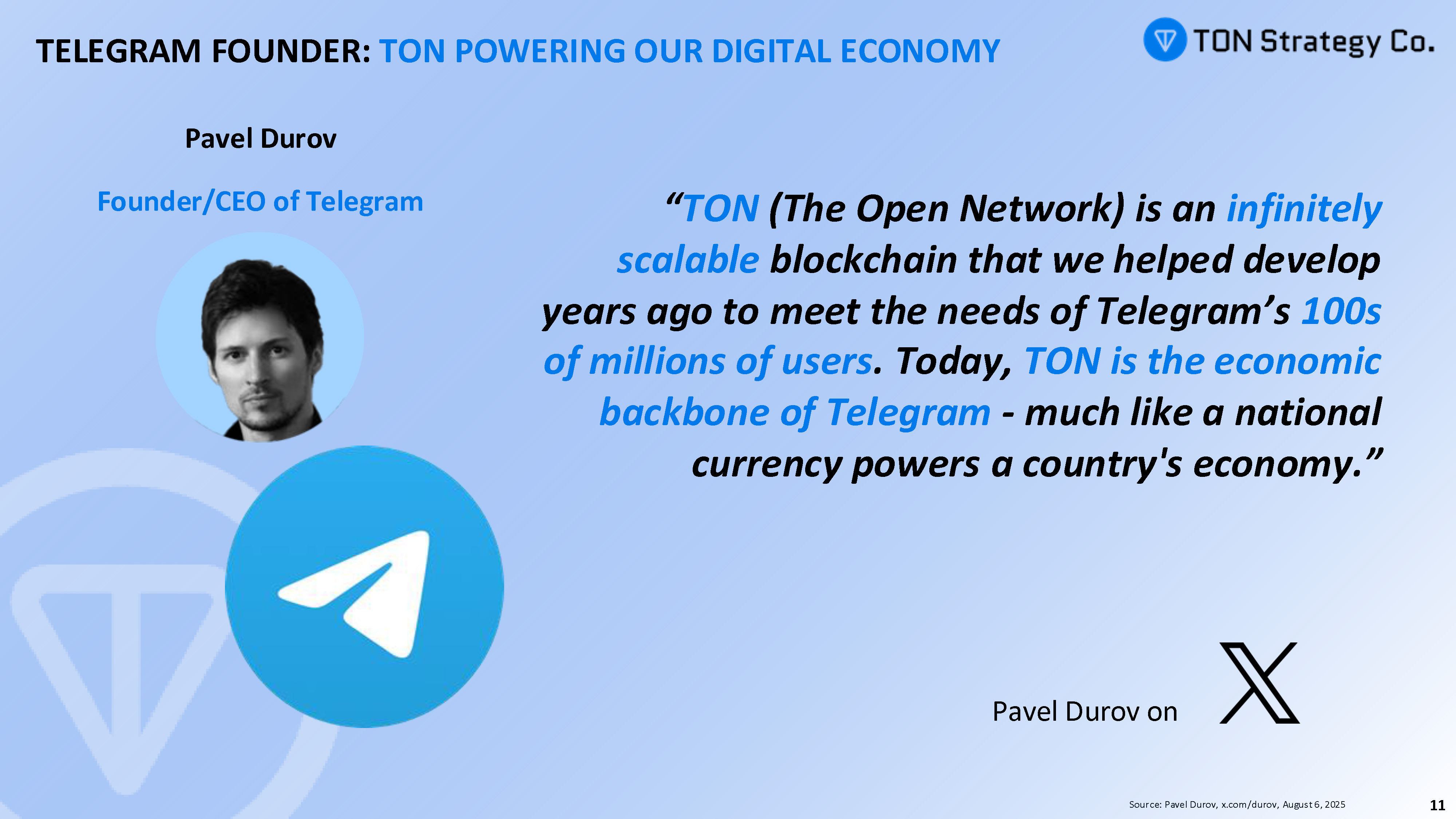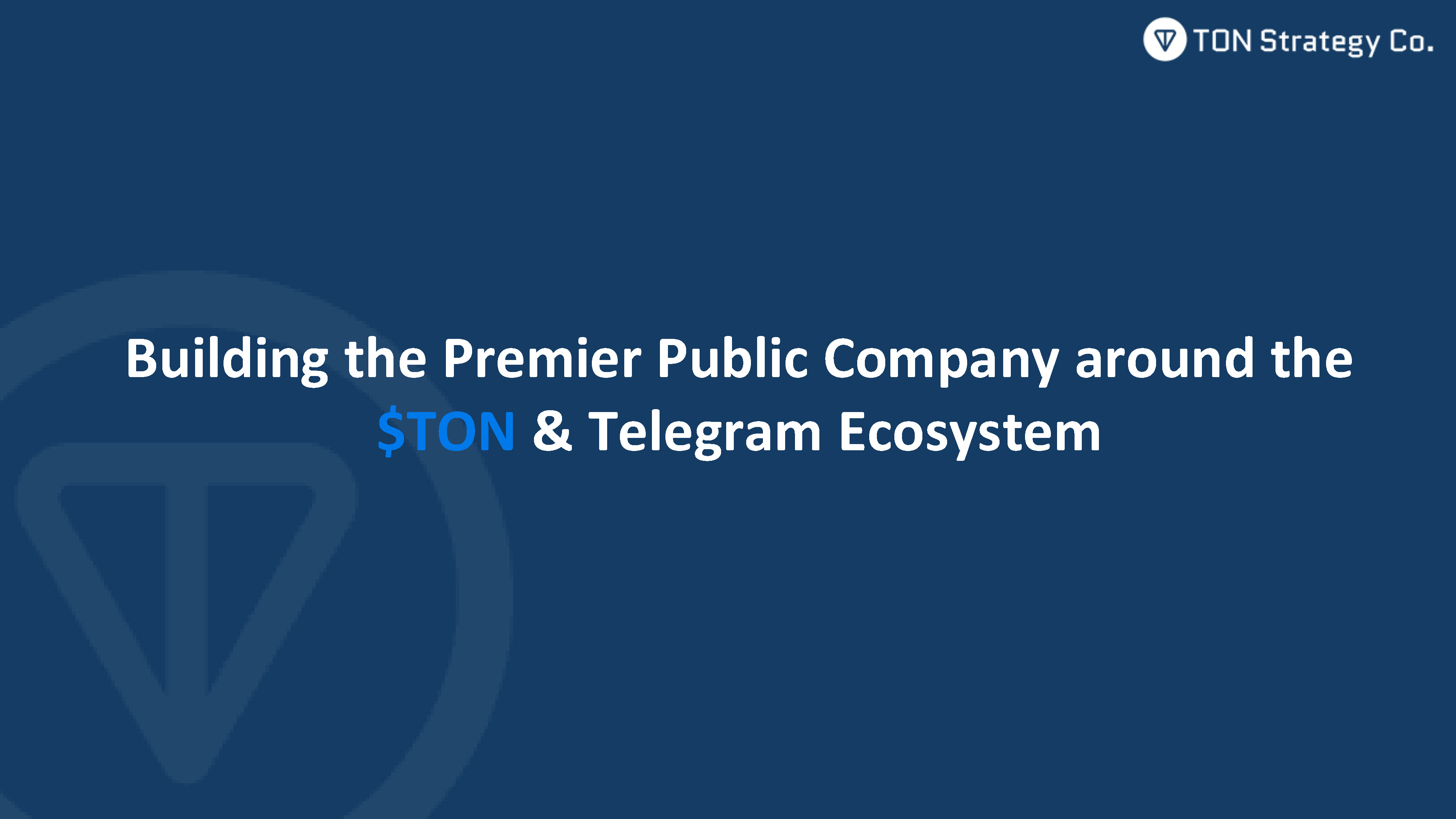 $TON is the native token of The Open Network (TON), a Layer-1 blockchain exclusively integrated into Telegram, where it provides the rails for payments, digital property, and decentralized applications across a platform with more than 1 billion monthly active users. In his remarks highlighted below, Mr. Stotz built on this foundation, presenting the Company’s investment thesis and outlining the opportunity created by $TON’s integration with Telegram.