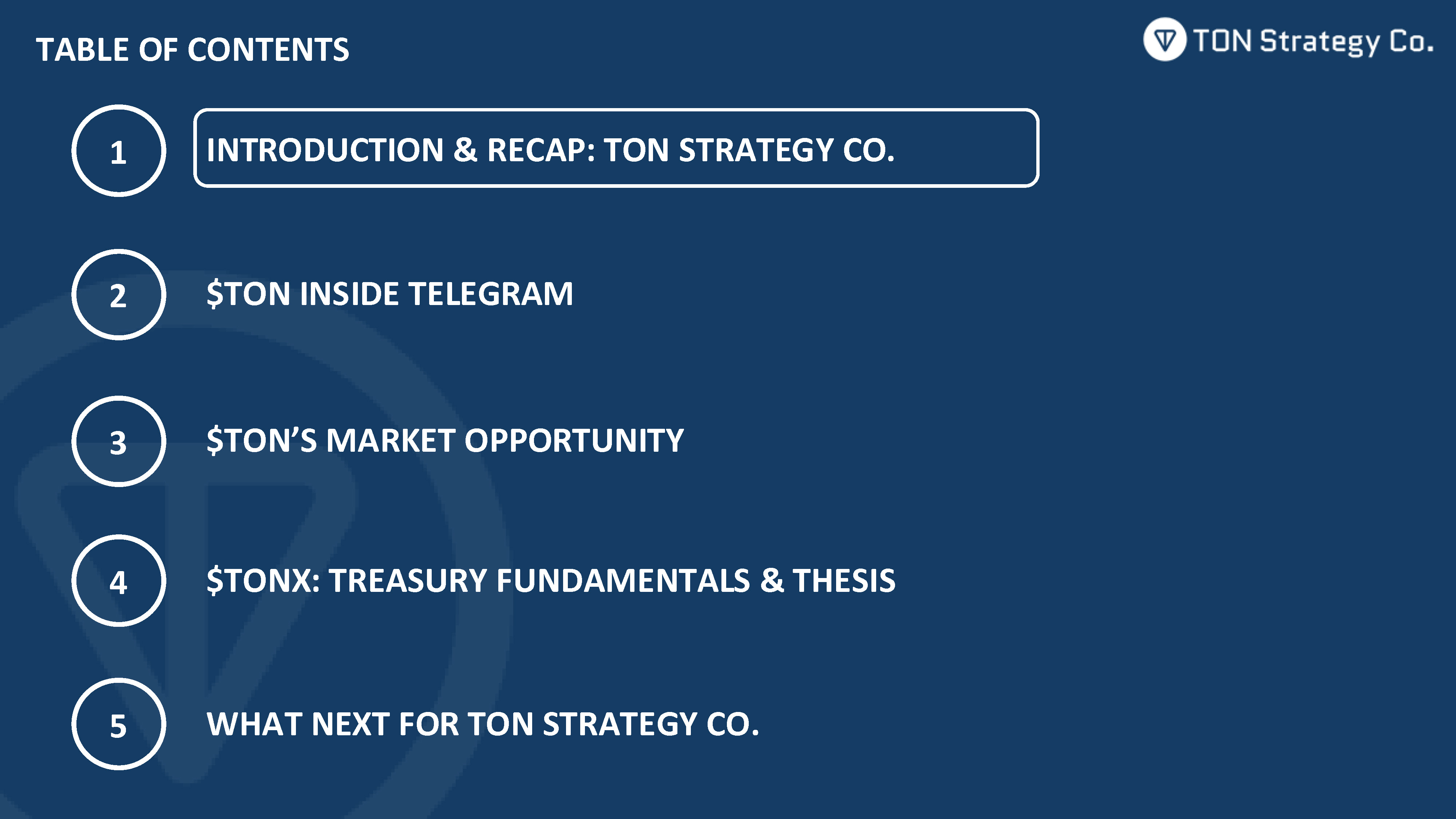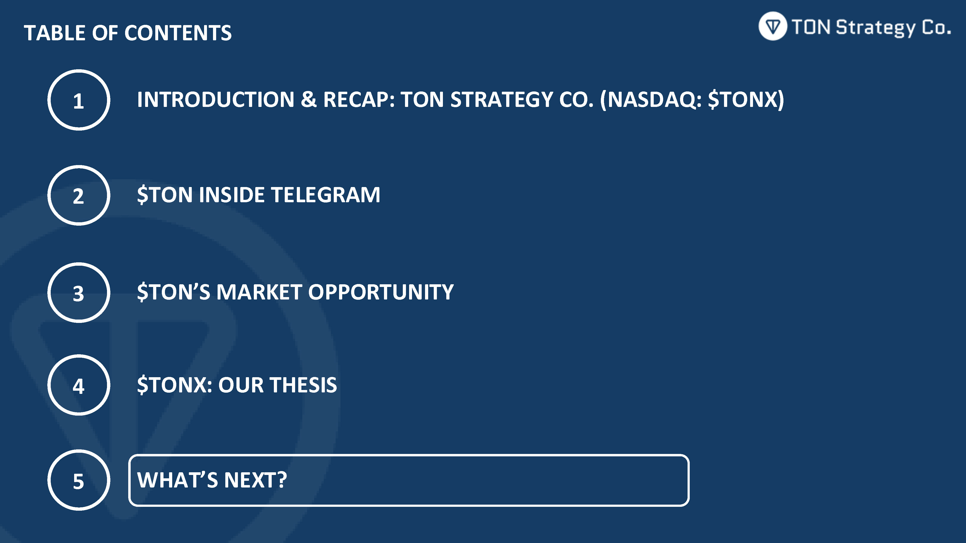 TON Strategy Company (Nasdaq: TONX) is focused on the accumulation of Toncoin ($TON) for long-term investment, whether acquired through deployment of proceeds from capital raising transactions, staking rewards or via open market purchases. The Company aims to steadily expand its $TON treasury, stake $TON, and to support the development of a tokenized economy inside Telegram’s billion-user platform.