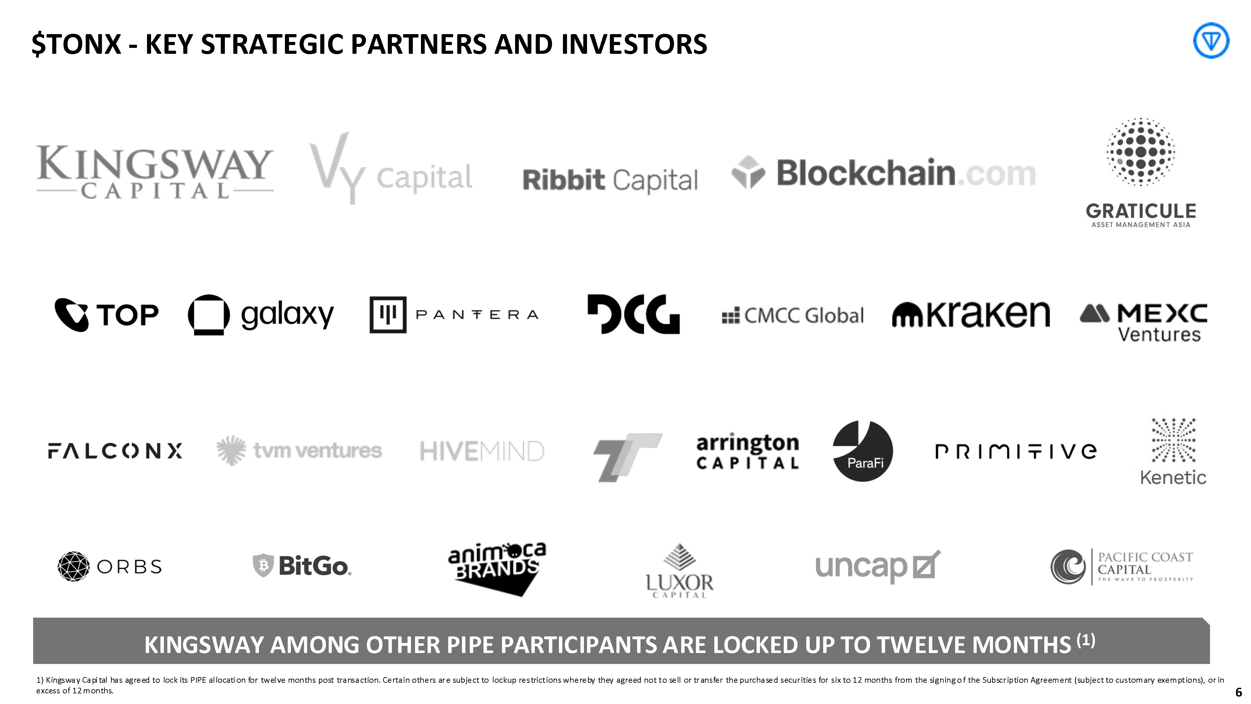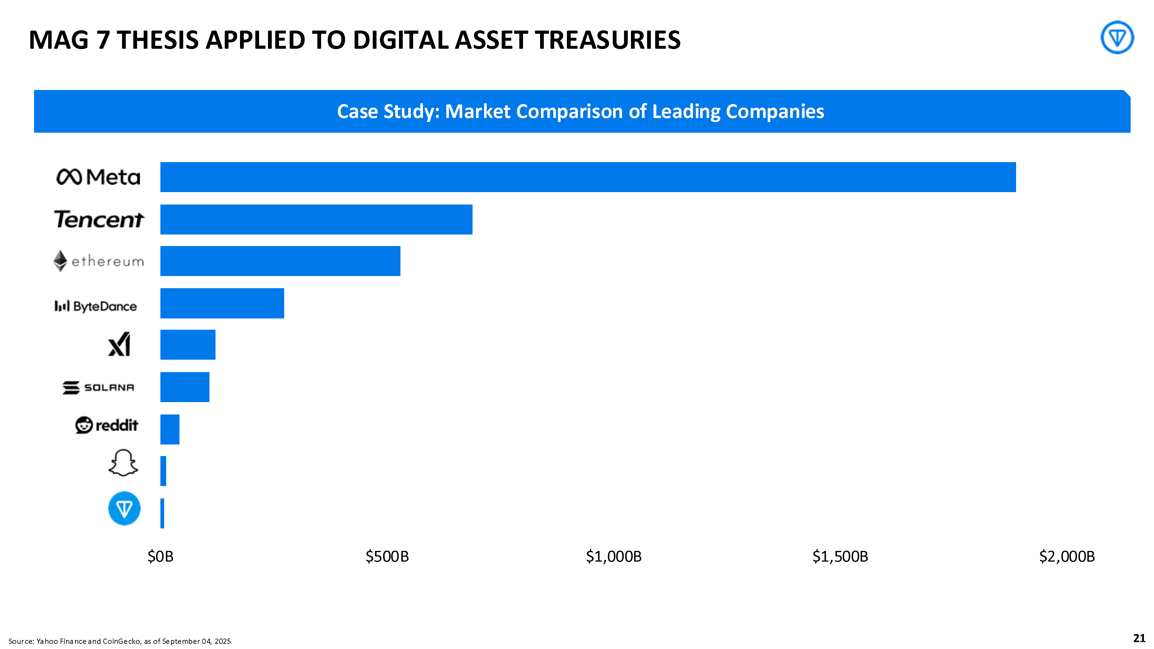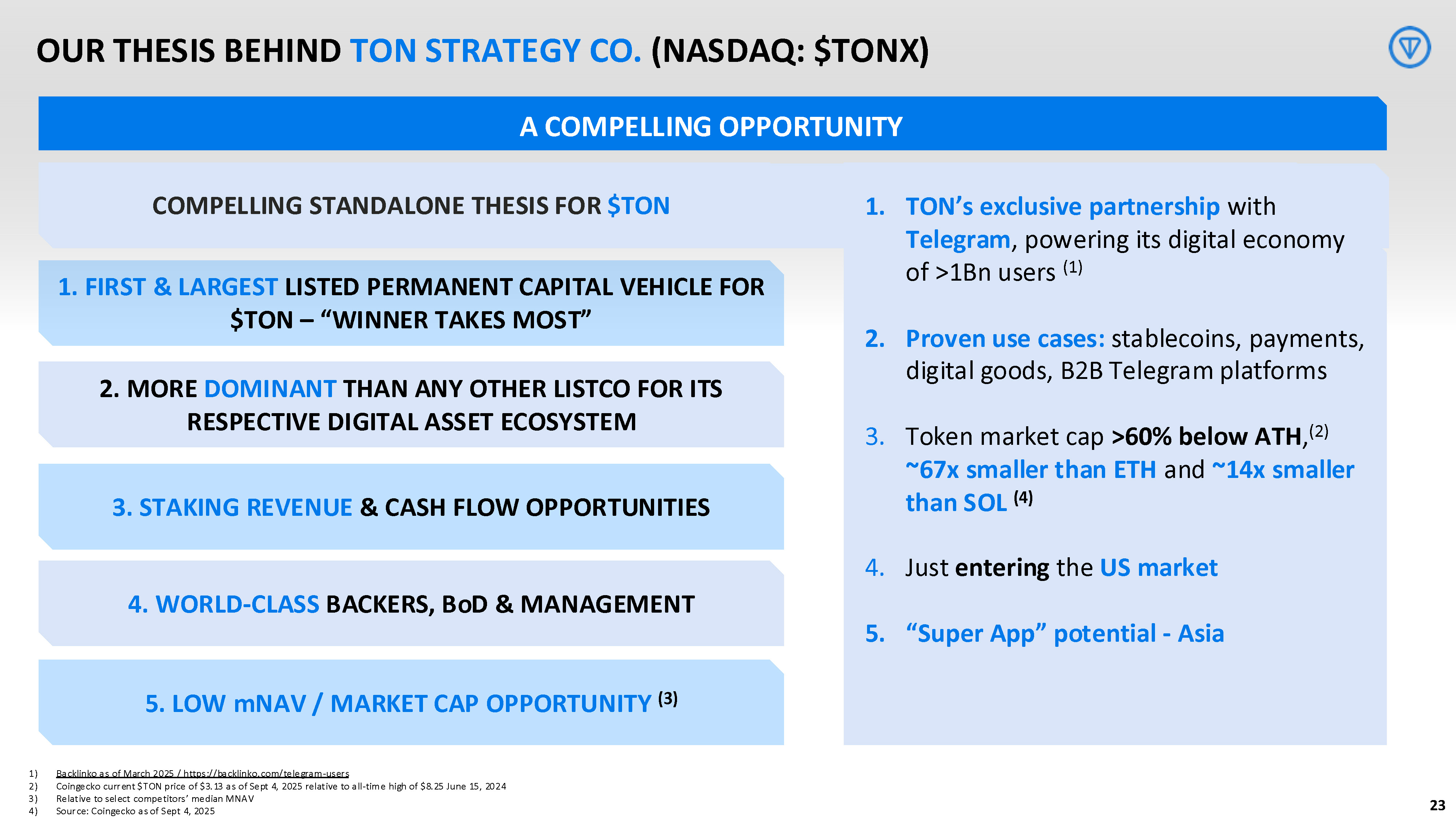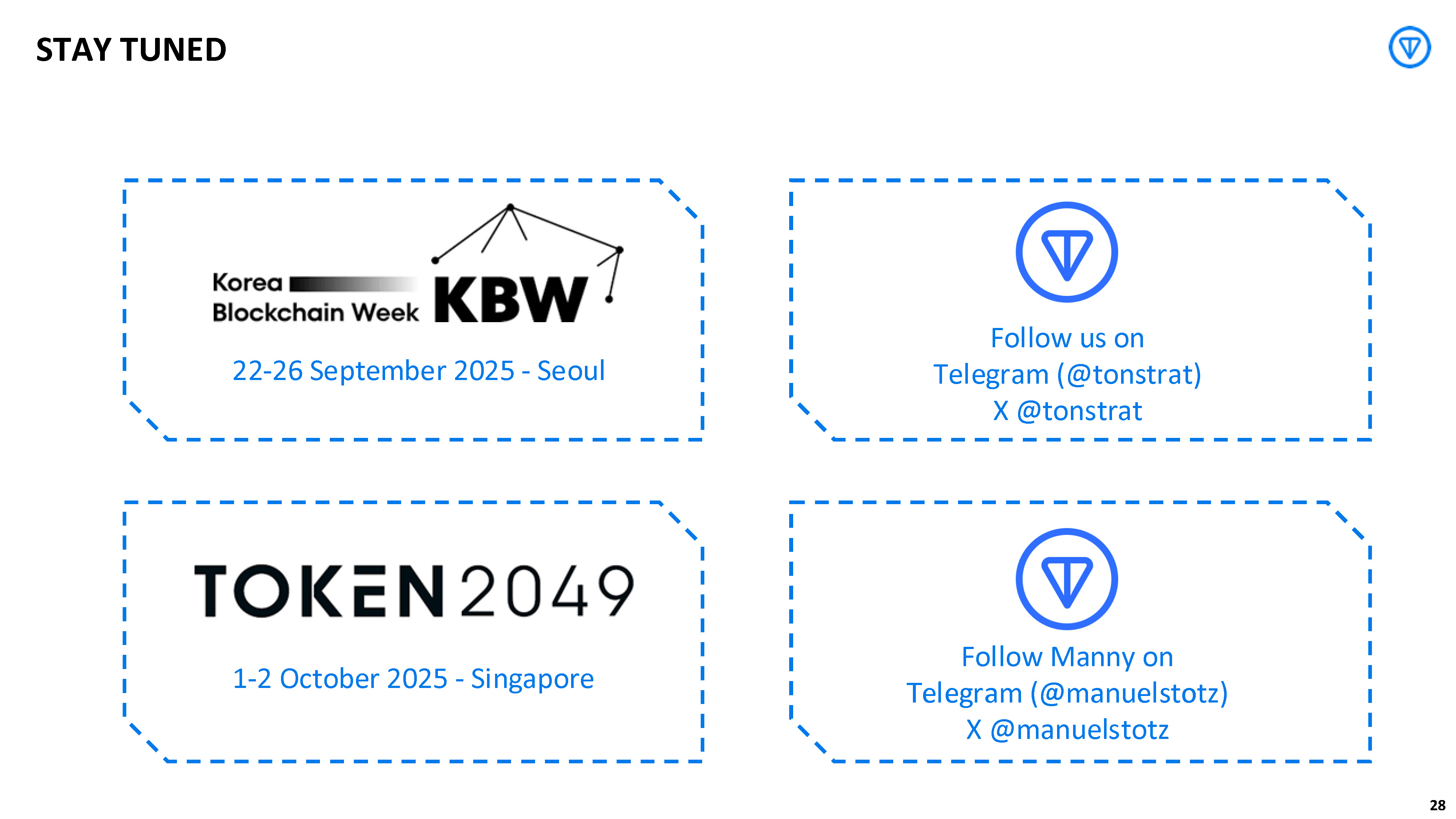 | ● | TON Strategy Company’s position – The Company is the first and largest listed permanent capital vehicle for $TON. Backed by world-class investors through a $558M PIPE (which closed on the 7th of August), it has since launched an up to $1B at-the-market program, reported $780M in treasury assets, rebranded and changed its ticker to TONX, and approved an up to $250M stock buyback program. | |