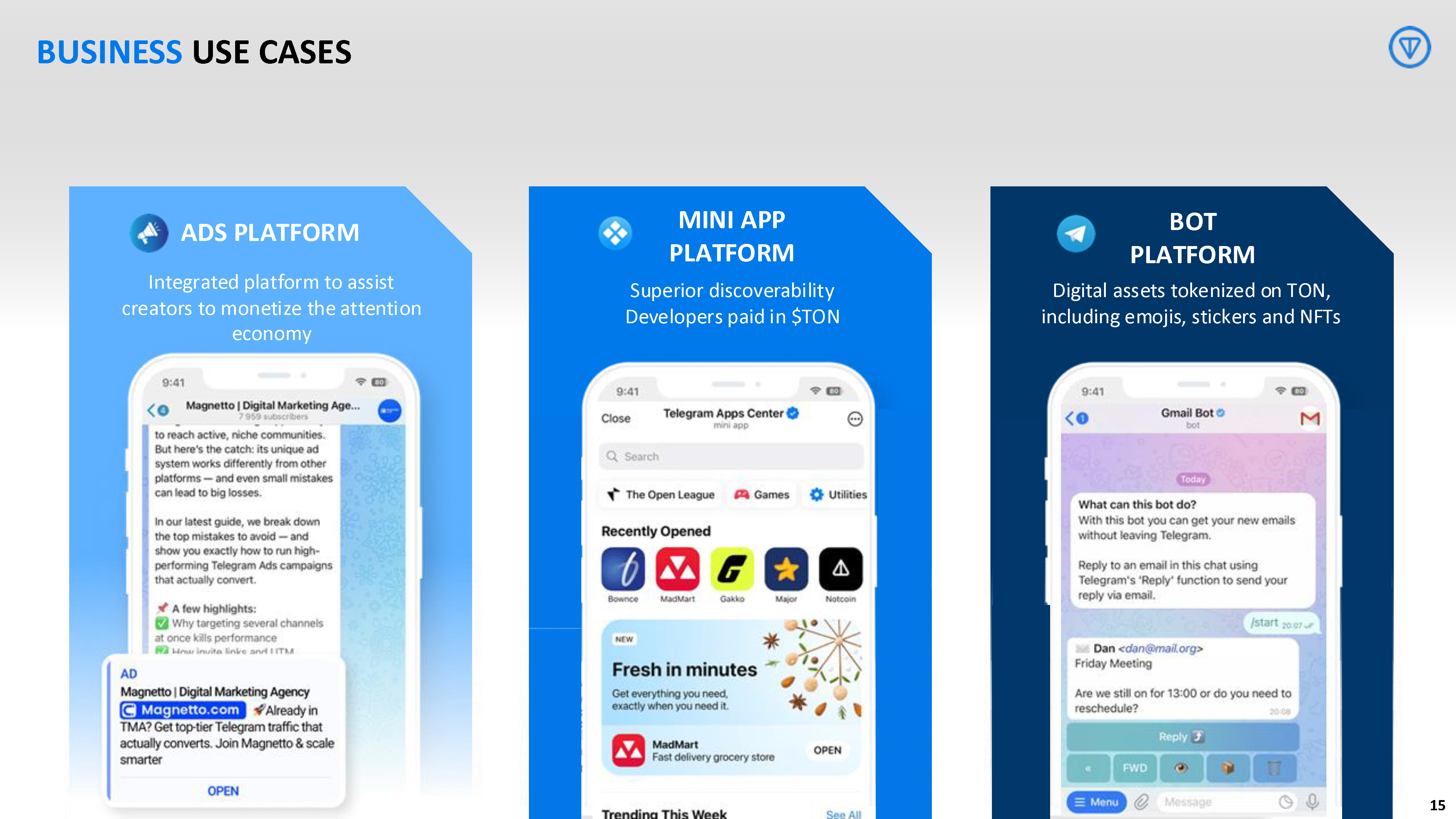 | ● | Telegram alignment – Mr. Stotz positioned $TON as the economic backbone of Telegram, giving its billion-plus digital citizens the ability to transact, hold stablecoins, and access applications within the messaging platform. Mr. Stotz compared this dynamic to the super app evolution in Asia, suggesting $TON could enable Telegram to leapfrog Western peers in payments and digital property. | |