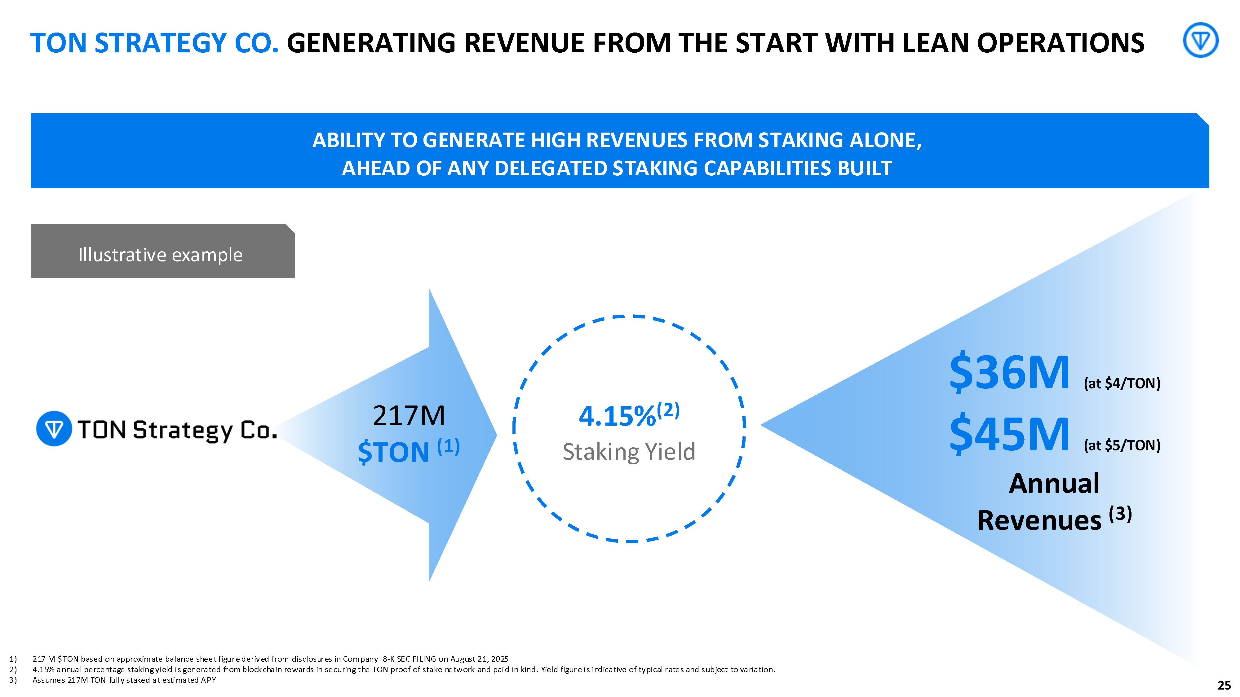 | ● | Staking and cash flow – TON Strategy Company expects to generate meaningful staking revenues from its more than 217 million $TON held, with plans to expand into proprietary staking infrastructure to capture additional value and potentially offer services to third parties. |