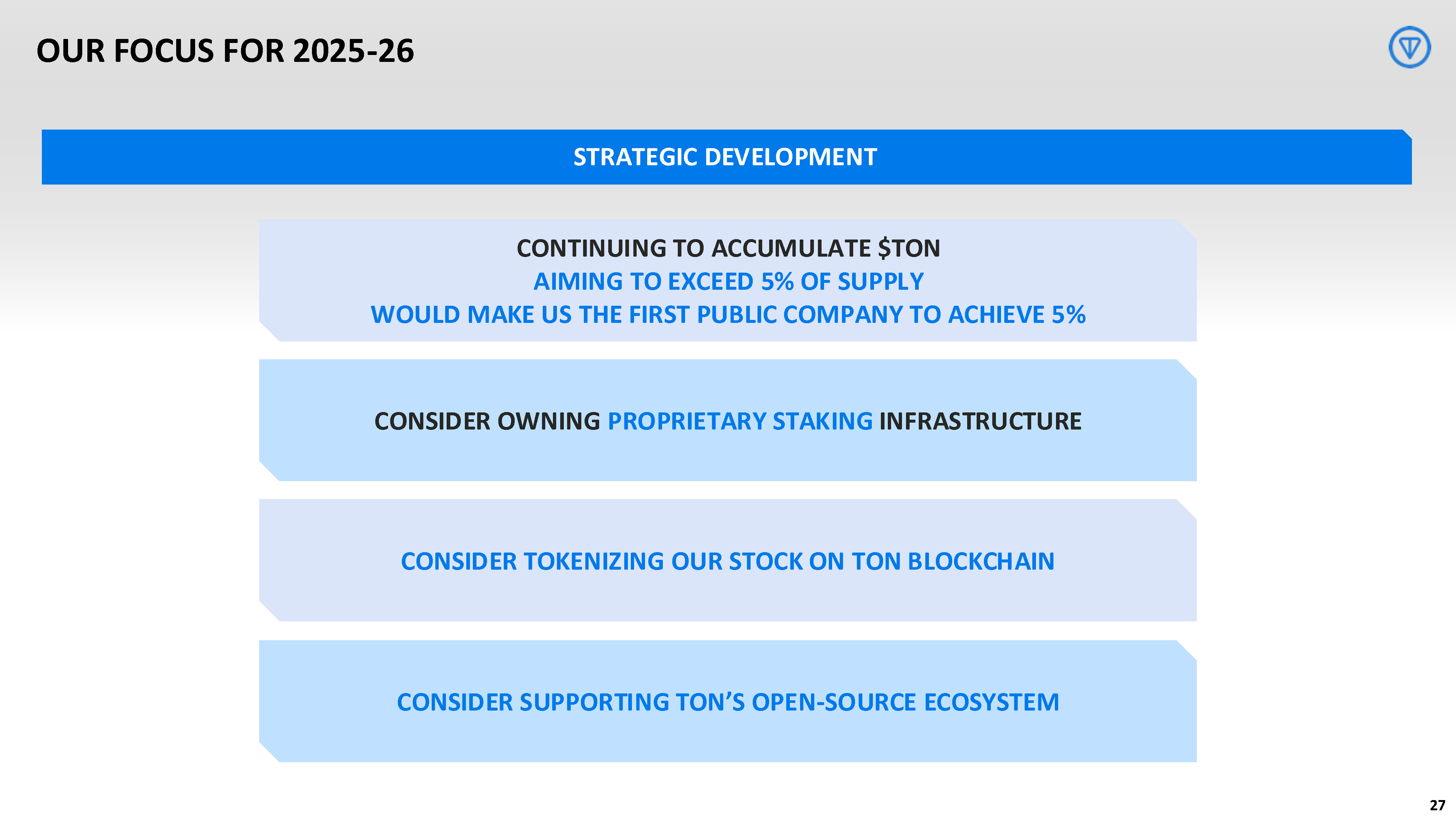 | ● | Vision and next milestones – The Company’s goals include surpassing 5% of $TON supply, considering pursuing tokenization of its own stock on-chain, and strengthening its role as a participant and infrastructure provider in the TON ecosystem. |