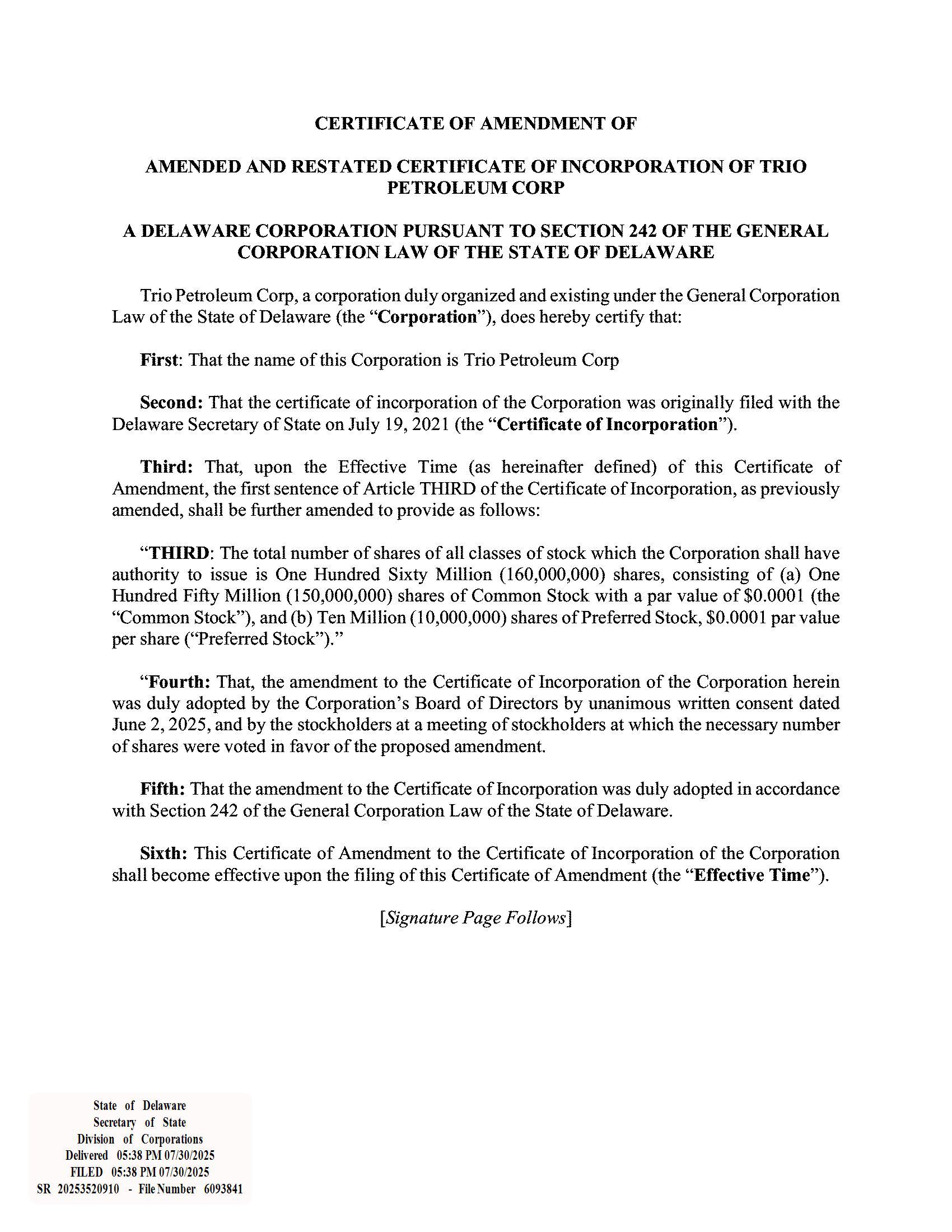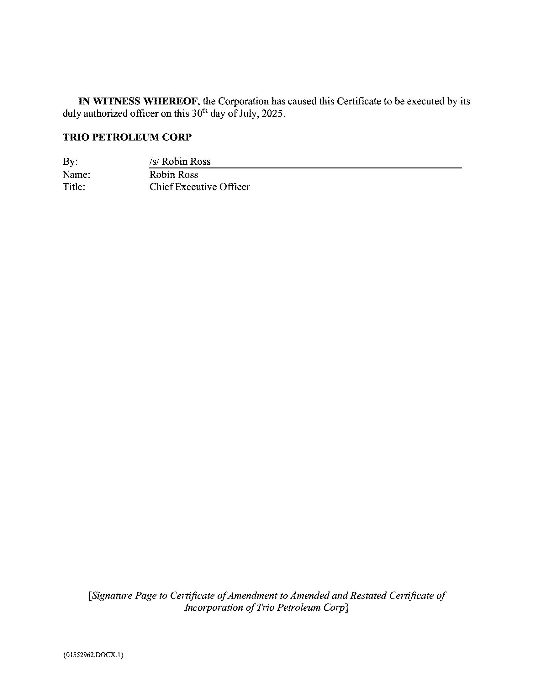 Pursuant to 18 U.S.C. § 1350, the undersigned officers of Trio Petroleum Corp (the “Company”) hereby certify that the Company’s Quarterly Report on Form 10-Q for the period ended July 31, 2025 (the “Report”) fully complies with the requirements of Section 13(a) or 15(d), as applicable, of the Securities Exchange Act of 1934 and that the information contained in the Report fairly presents, in all material respects, the financial condition and results of operations of the Company.