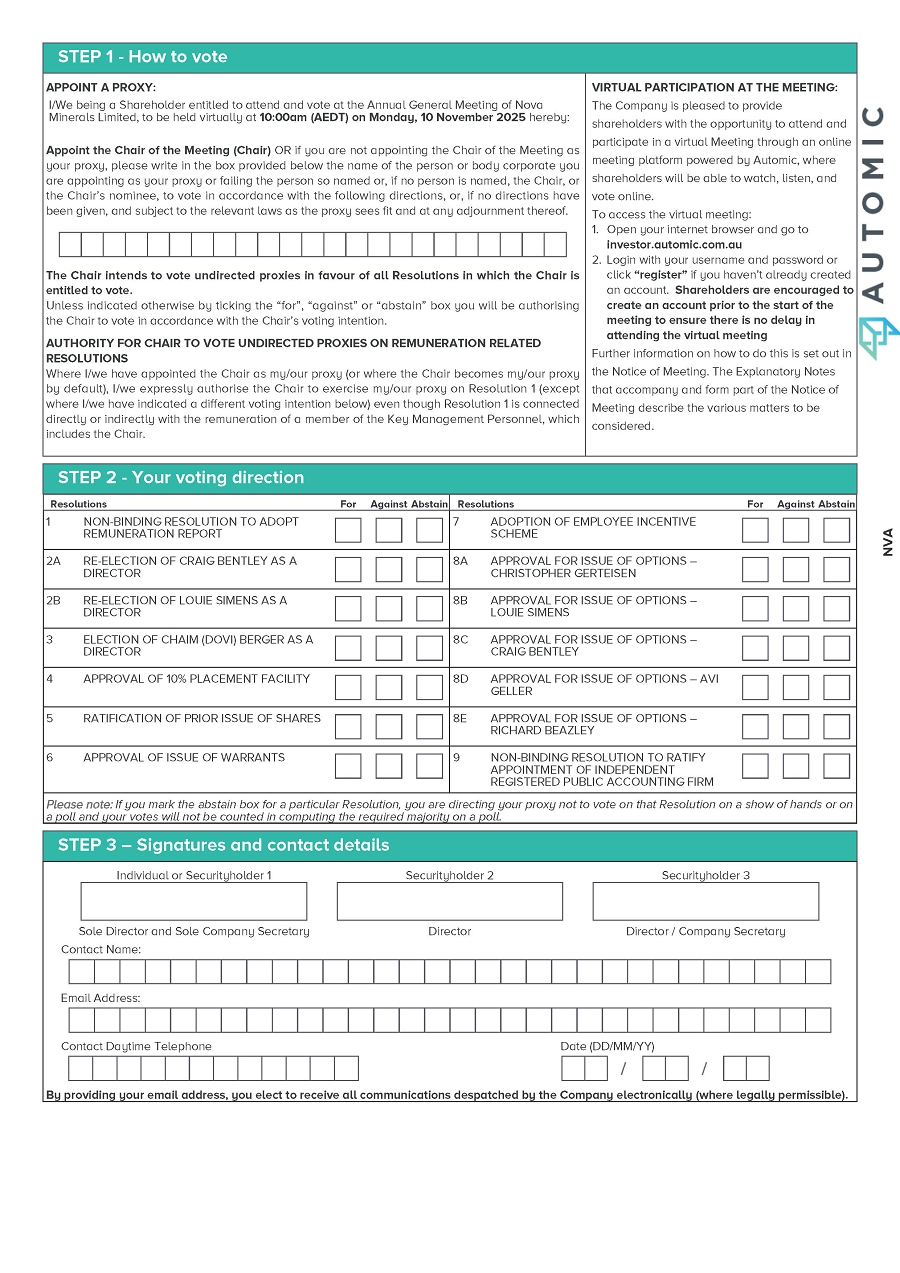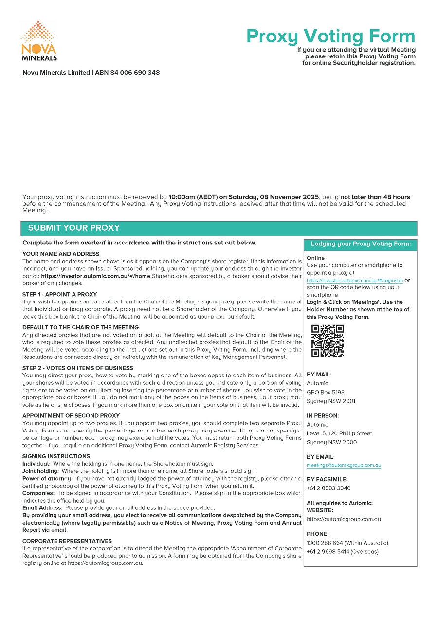 Shareholders may submit questions in advance of the Meeting by email to the Company Secretary at ian@novaminerals.com.au. Responses will be provided at the Meeting in respect of all valid questions received prior to 10:00 am (AEDT) on 8 November 2025.