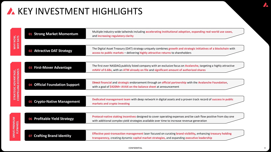 AVAX One will be the first NASDAQ-listed company with a dedicated mission to provide pure-play exposure to the Avalanche ecosystem. The Company’s primary strategy will be to maximize AVAX per-share accretion for its shareholders through a disciplined, professionally managed approach to its digital asset treasury. Led by a team of veterans from institutional finance and advised by leaders from across the digital asset industry, AVAX One is being built to be the premier, regulated gateway for public market investors to participate in the growth of the onchain economy.