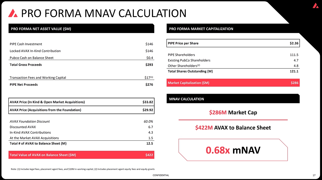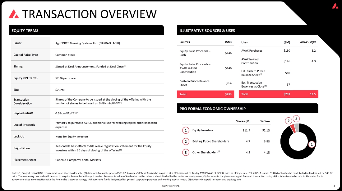 Of the aggregate $292.4 million purchase price for the Shares, an aggregate of (i) $146.4 million is expected to be paid in cash, the cryptocurrency stablecoin commonly referred to as USDC (“USDC”) based on a purchase price of $1.00 per USDC, and the cryptocurrency stablecoin commonly referred to as USDT (“USDT” and together with USDC, “Stablecoins”) based on a purchase price of $1.00 per USDT, and (ii) $146.0 million is expected to be paid in the native cryptocurrency of the Avalanche Network, referred to as AVAX Tokens (“AVAX Tokens”), which will be valued for purposes of the Subscription Agreements at the volume-weighted average price of an AVAX Token (rounded to two decimal places) during the 14 consecutive calendar days ending on the Funding Payment Deadline (as defined in the Subscription Agreements) based on midnight UTC, calculated by using the hourly volume and the Messari Price as reported on messari.io (the “Specified AVAX Token Value”). Because the Specified AVAX Token Value will not be set until the Funding Payment Deadline, the aggregate amount of Shares to be issued in the Offering is not currently known. Based on an indicative value of $33.82 per AVAX Token, which was the Messari Price of AVAX Tokens at 4:00 pm on September 19, 2025, as reported on messari.io (the “Illustrative AVAX Token Price”), the aggregate number of Shares that are expected to be issued is 112 million. Such amount is preliminary and subject to change based on changes in AVAX Token prices.