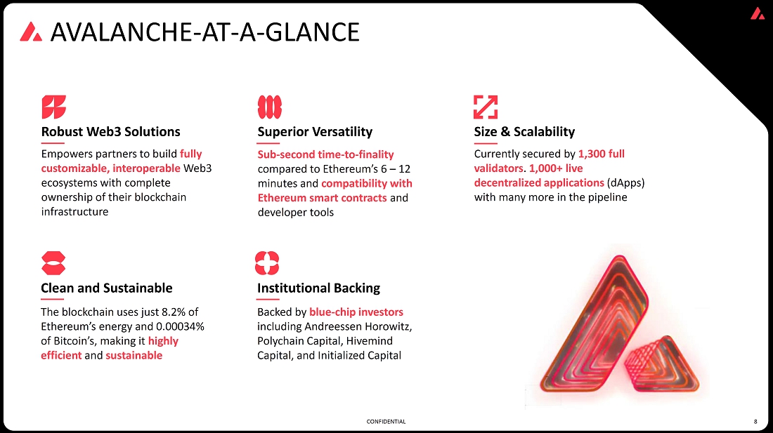 Avalanche is a high-speed, institutional-grade blockchain designed to be a foundational digital settlement layer for the future of finance. Its technology allows global leaders like KKR, Apollo and J.P. Morgan Chase to launch their own custom, compliant blockchains for the tokenization of real-world assets. The network is secured by $6.2 billion in staked assets.