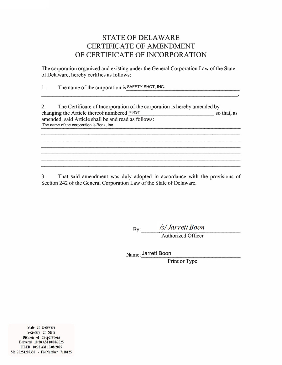 SCOTTSDALE, AZ – October 9, 2025 (GLOBE NEWSWIRE) – Safety Shot, Inc. (Nasdaq: SHOT) (the “Company”) today announced that it has changed its corporate name to Bonk, Inc. to reflect its new strategic direction as a leader at the intersection of public markets and the digital asset ecosystem.