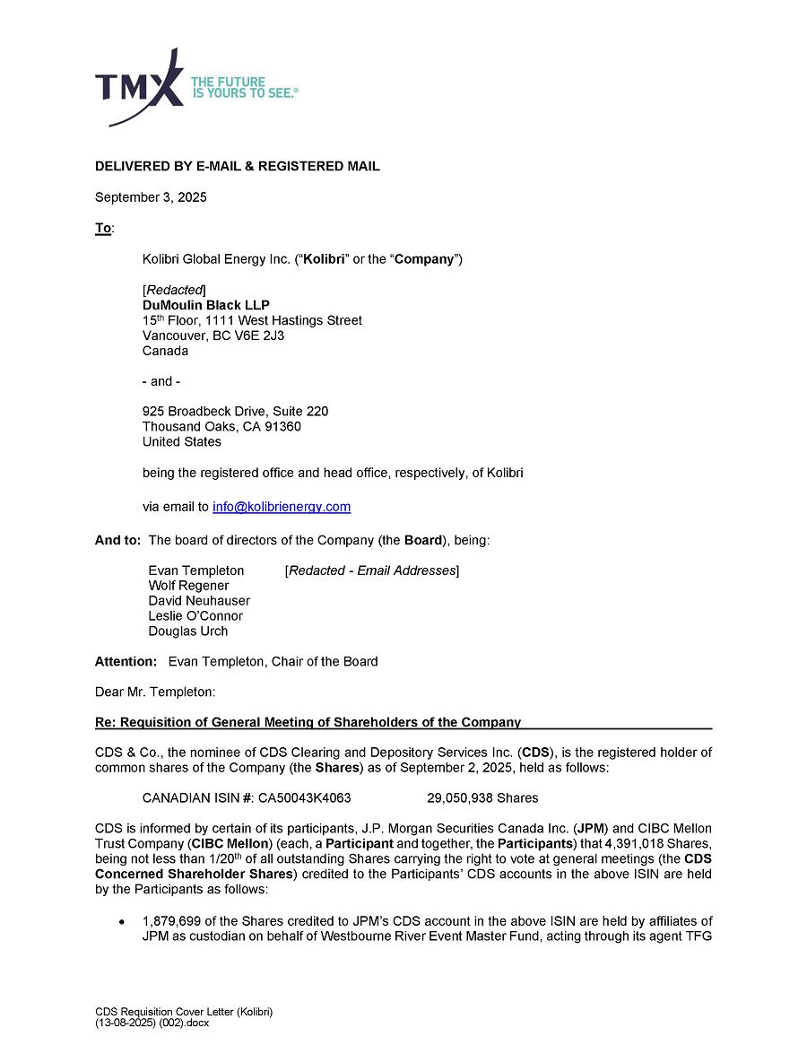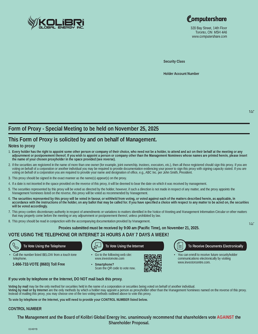 October 15, 2025, THOUSAND OAKS, California – Kolibri Global Energy Inc. (the “Company” or “Kolibri”) (TSX: KEI, NASDAQ: KGEI) announced today that it has filed a management information circular and related materials (the “Circular”) in connection with a special meeting of shareholders (the “Meeting”) called by the Company in response to a shareholder requisition made on behalf of TFG Asset Management UK LLP. (“TFG”). TFG currently holds 7,070,568 Kolibri shares, representing 19.9% of the Company’s issued and outstanding shares. The purpose of the Meeting is to vote on altering the Notice of Articles of the Company to cap the number of common shares that the Company is authorized to issue (the “Share Limit”) at 37,367,894 (the “Proposed Resolution”). The Meeting will be held at 9:00 a.m. (Pacific Time) on November 25, 2025 at the Hyatt Regency Westlake, 880 South Westlake Blvd, Westlake Village, CA 91361, United States.