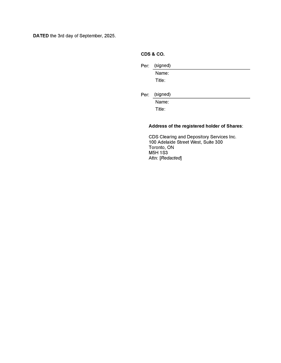 Completed forms of proxy must be deposited at or mailed to the office of the Company’s registrar and transfer agent, Computershare Trust Company of Canada, Proxy Department, 320 Bay Street, 14th Floor, Toronto, ON M5H 4A6; or sent by fax to Computershare Trust Company of Canada, Proxy Department at 1-866-249-7775 within North America or (416) 263-9524 outside North America, not later than two business days, excluding Saturdays, Sundays and holidays, prior to the time of the Meeting, unless the chairman of the Meeting elects to exercise his discretion to accept proxies received subsequently. Shareholders may also vote online or by telephone as outlined below. The time limit for the deposit of proxies may be waived or extended by the Chair of the Meeting at his or her discretion, without notice.