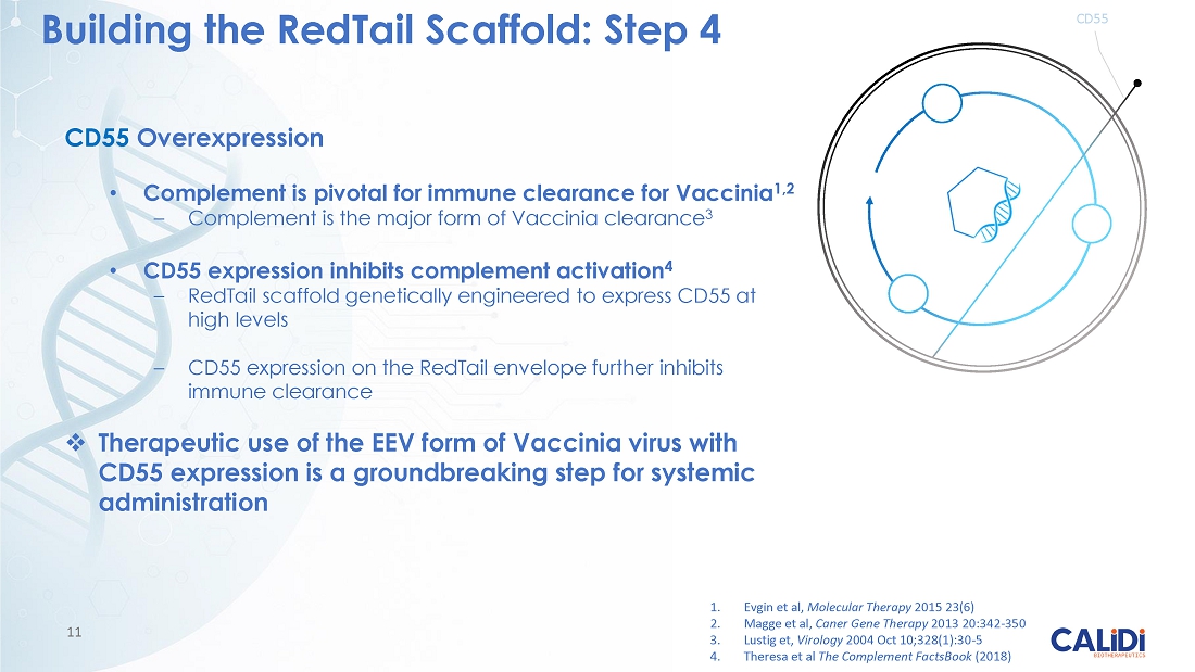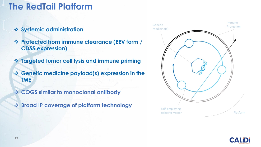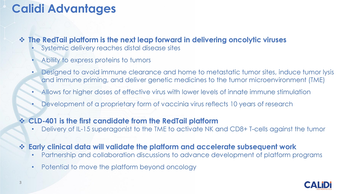 The SAB will work with Calidi to further develop its RedTail platform and advance CLD-401 into the clinic. RedTail is Calidi’s groundbreaking approach to genetic medicines that utilizes an enveloped form of vaccinia virus genetically engineered to overexpress CD55 and avoid immune clearance, allowing for systemic delivery and targeting of genetic medicine payload(s) to sites of disease.