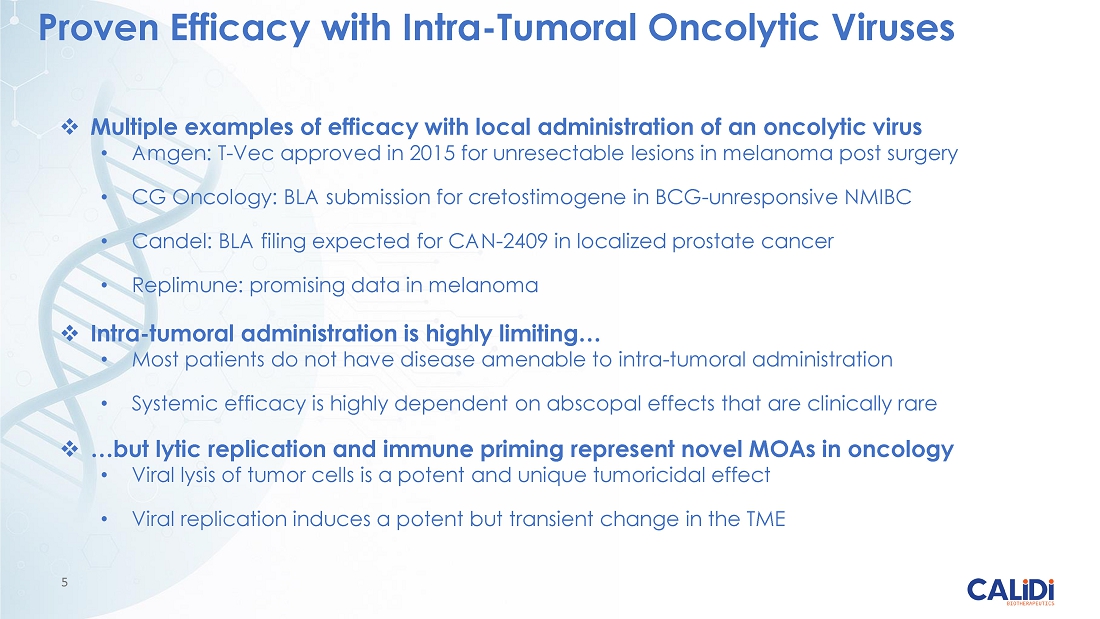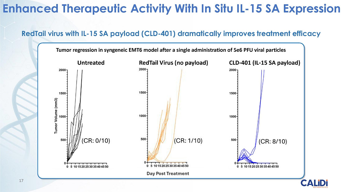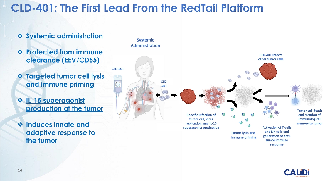 CLD-401, the first lead from the RedTail platform, is designed to home to metastatic sites after systemic administration, replicate only in tumors cells, induce an immune priming event at the tumor site, and express high levels of IL-15 superagonist in the tumor microenvironment, a potent cytokine that induces NK and T-cell responses to the tumor.