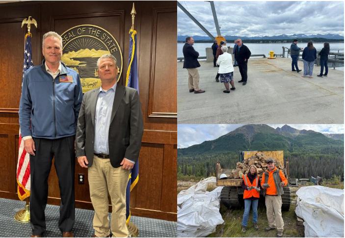 Figure 1. Left: Alaska Governor Mike Dunleavy with Nova’s CEO Christopher Gerteisen. Top right: Port MacKenzie Loading Dock – Port Director Dave Griffin, Mayor Edna DeVries, Alaska Rep. Kevin McCabe, and others. Bottom Right: U.S. Senator Lisa Murkowski and Nova Minerals CEO Christopher Gerteisen at the Estelle site.