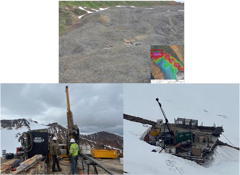 Figure 3. 2025 RPM drilling. Bottom left: Diamond rig at RPM North, Bottom right: Diamond rig at RPM Valley. Center: RC rig at the RPM glaical lobe area.