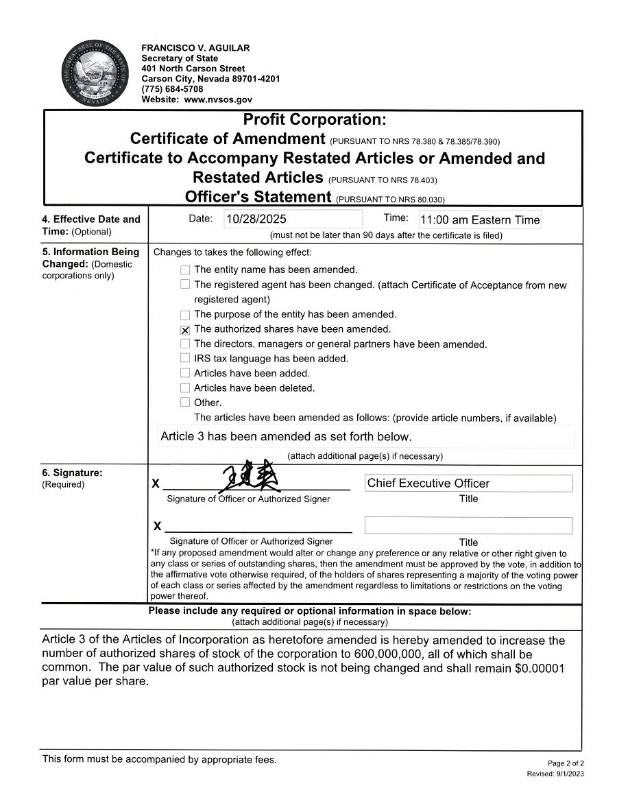 A quorum was present for the Annual Meeting. At the Annual Meeting, four proposals were submitted to the stockholders for approval as set forth in the definitive Proxy Statement (the “Proxy Statement”) as filed with the U.S. Securities and Exchange Commission (the “SEC”) on October 6, 2025. As of the record date, September 30, 2025, a total of 196,514,084 shares of Common Stock were issued and outstanding and entitled to vote. The holders of record of 156,695,414 shares of Common Stock were present in person or represented by proxy at said meeting. Such amounts represented approximately 79.74% of the Common Stock entitled to vote at such meeting and of the Company’s total voting power.