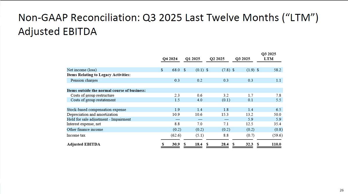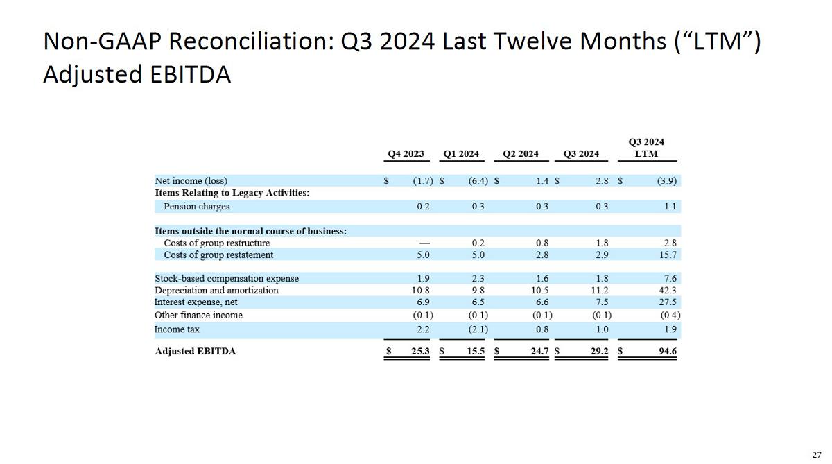 調整後EBITDAは、減価償却費および償却費、支払利息、受取利息、法人所得税、ならびにその他の追加除外項目および調整項目を除いた純利益(損失)と定義される(調整後EBITDA調整表参照)。このような追加除外金額には、関連する負債が株式で決済されると予想される株式ベースの報酬U.S.GAAPの費用、アーンアウト負債の価値の変動、閉鎖された確定給付年金制度を含む事業のレガシー部分(取引が行われなくなった部分)に関する収支などが含まれる。(1)リストラクチャリング費用(従業員の退職、経営陣の交代、リストラクチャリング、兼業費用、施設の閉鎖に関連する費用、統合費用など)、(2)合併・買収費用、(3)通常の事業過程以外の損益、(4)過去に発行された財務諸表の修正再表示費用。