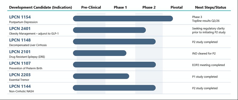 LPCN 1154 is currently in development. There can be no assurance as to whether the results of the clinical trials in LPCN 1154 for postpartum depression will support an NDA submission or whether an NDA submission will be accepted for review or approved by the FDA, including the oral route related brexanolone or its metabolites exposure profile relative to injectable brexanolone. A safety and efficacy study in the patient population is ongoing, however there can be no assurance that the safety and efficacy study will be completed, or that the results from the study will meet the primary endpoint. Further, there can be no assurance that additional studies will not be required, and if they are required that we will have sufficient resources to conduct such additional studies to enable an NDA submission.